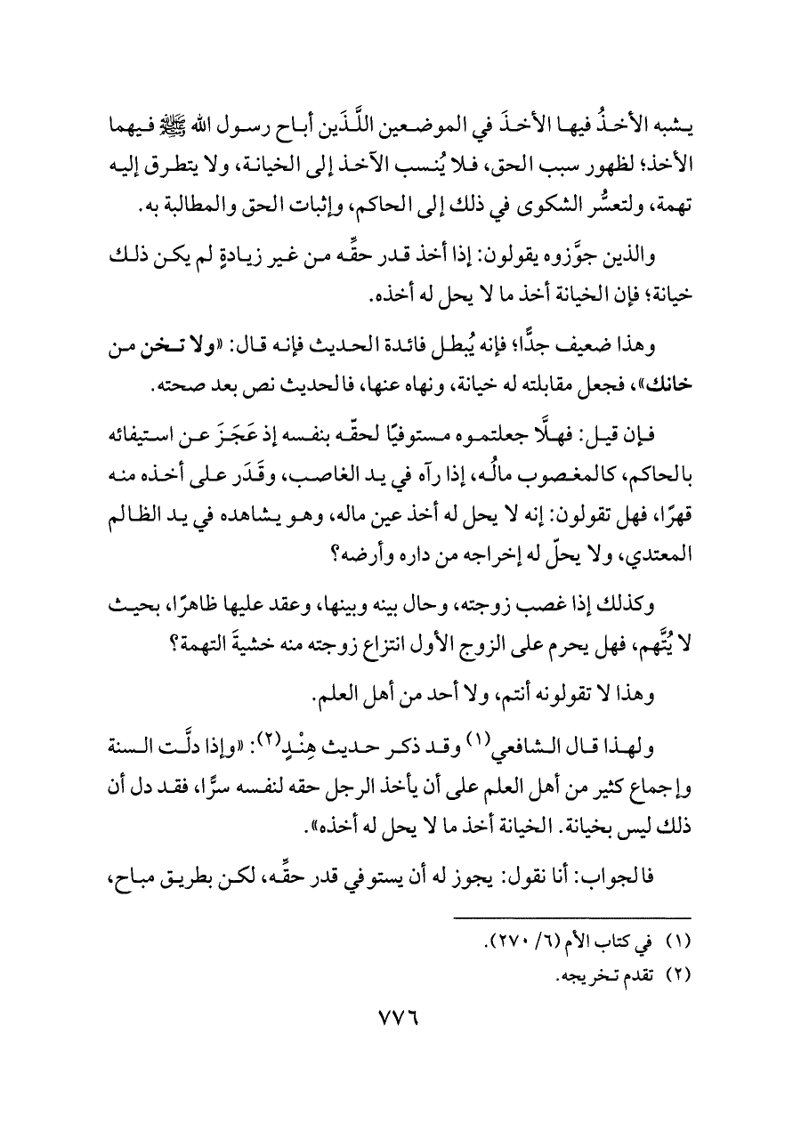 ولهذا قال الشافعي (¬١) وقد ذكر حديث هِنْدٍ (¬٢): «وإذا دلَّت السنة وإجماع كثير من أهل العلم على أن يأخذ الرجل حقه لنفسه سرًّا، فقد دل أن ذلك ليس بخيانة. الخيانة أخذ ما لا يحل له أخذه».