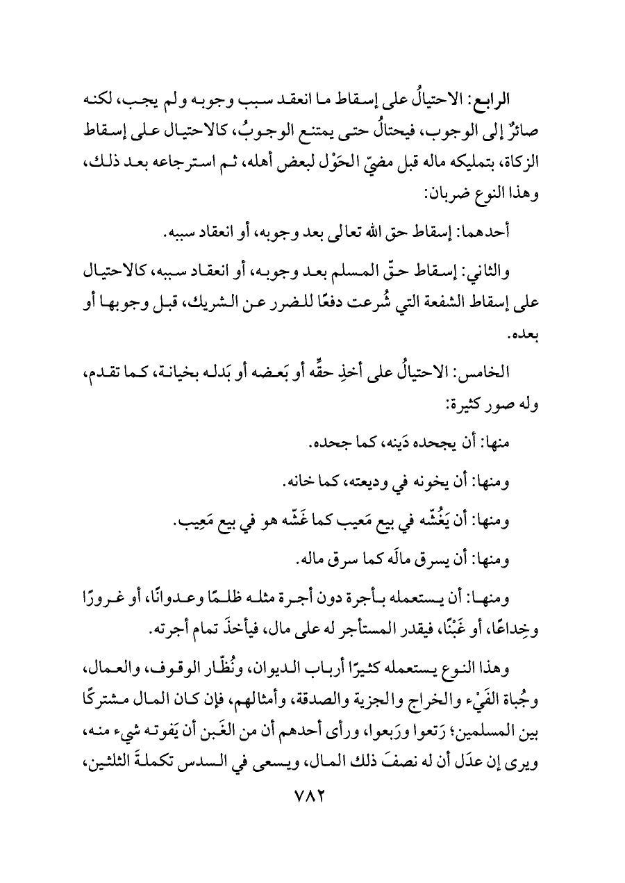 الرابع: الاحتيالُ على إسقاط ما انعقد سبب وجوبه ولم يجب، لكنه صائرٌ إلى الوجوب، فيحتالُ حتى يمتنع الوجوبُ، كالاحتيال على إسقاط الزكاة، بتمليكه ماله قبل مضيّ الحَوْل لبعض أهله، ثم استرجاعه بعد ذلك، وهذا النوع ضربان: