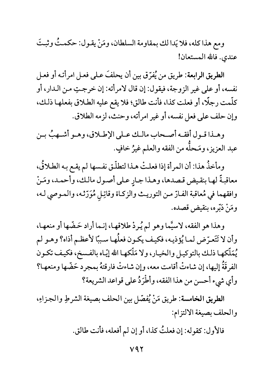 وهذا هو الفقه، لاسيَّما وهو لم يُردْ طلاقها، إنما أراد حَضّها أو منعها، وأن لا تَتَعرّض لما يُؤذيه، فكيف يكون فعلُها سببًا لأعظم أذاه؟ وهو لم يُمَلّكها ذلك بالتوكيل والخيار، ولا مَلّكها الله إيّاه بالفسخ، فكيف تكون الفرقَةُ إليها، إن شاءتْ أقامت معه، وإن شاءتْ فارقتهُ بمجرد حَضّها ومنعها؟ وأي شيء أحسن من هذا الفقه، وأطْرَدُ على قواعد الشريعة؟