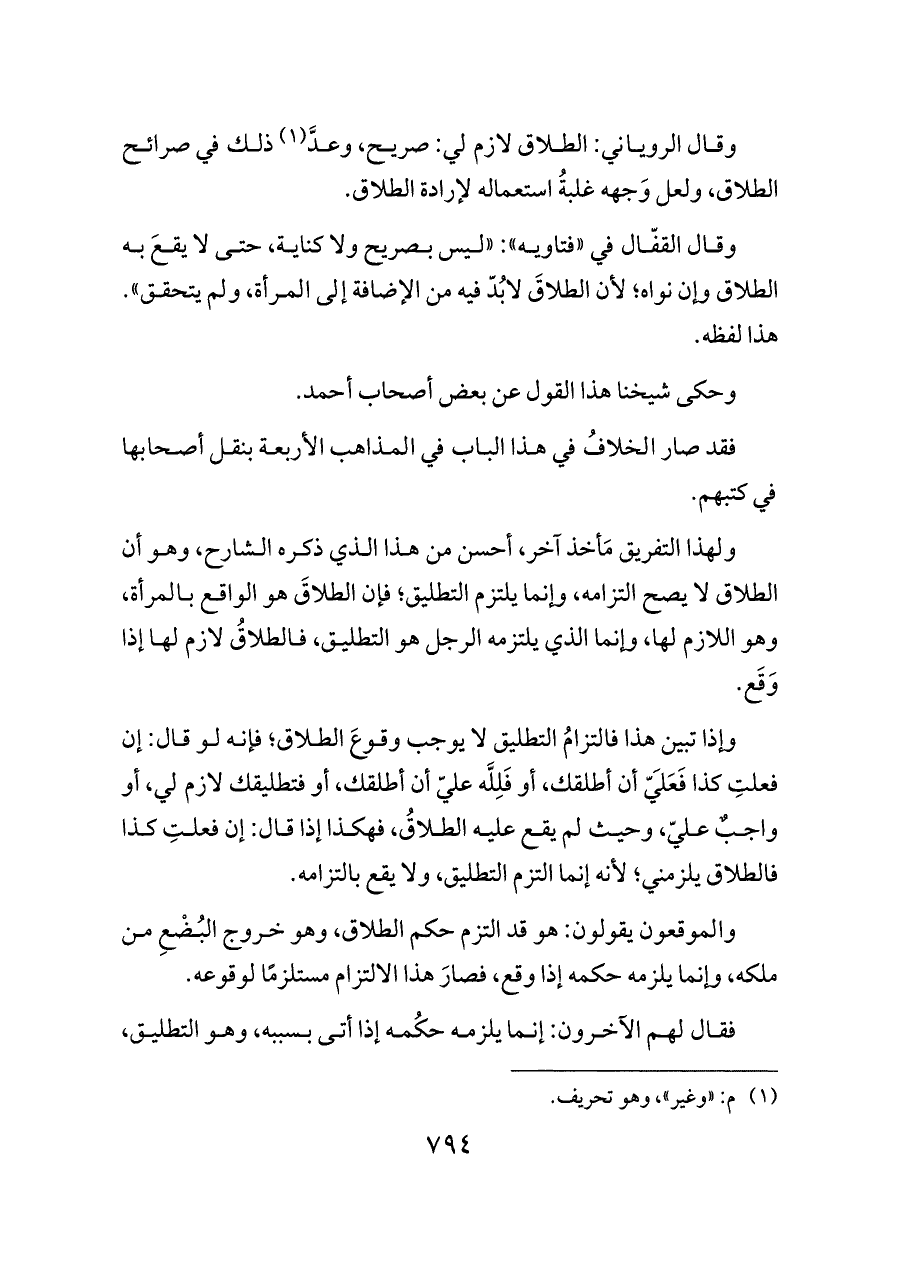 وإذا تبين هذا فالتزامُ التطليق لا يوجب وقوعَ الطلاق؛ فإنه لو قال: إن فعلتِ كذا فَعَلَيّ أن أطلقك، أو فَلِلَّه عليّ أن أطلقك، أو فتطليقك لازم لي، أو واجبٌ عليّ، وحيث لم يقع عليه الطلاقُ، فهكذا إذا قال: إن فعلتِ كذا فالطلاق يلزمني؛ لأنه إنما التزم التطليق، ولا يقع بالتزامه.