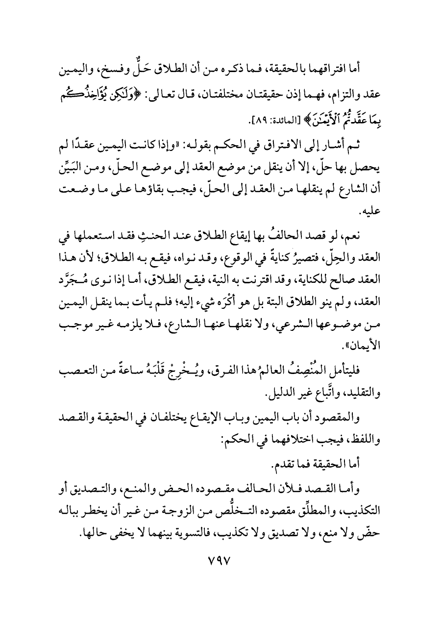 أما افتراقهما بالحقيقة، فما ذكره من أن الطلاق حَلٌّ وفسخ، واليمين عقد والتزام، فهما إذن حقيقتان مختلفتان، قال تعالى: {وَلَكِنْ يُؤَاخِذُكُمْ بِمَا عَقَّدْتُمُ الْأَيْمَانَ} [المائدة: ٨٩].