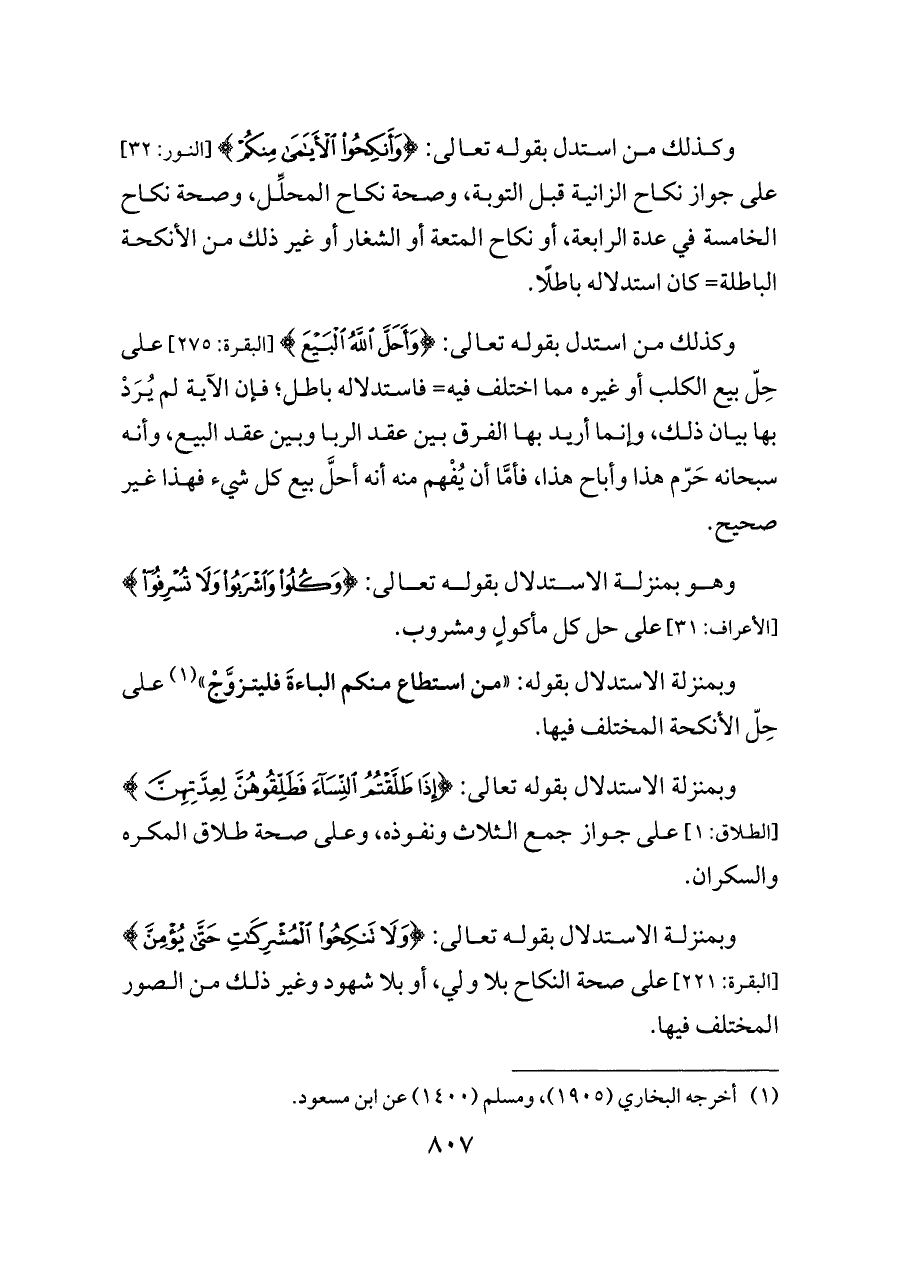 وكذلك من استدل بقوله تعالى: {وَأَنْكِحُوا الْأَيَامَى مِنْكُمْ} [النور: ٣٢] على جواز نكاح الزانية قبل التوبة، وصحة نكاح المحلِّل، وصحة نكاح الخامسة في عدة الرابعة، أو نكاح المتعة أو الشغار أو غير ذلك من الأنكحة الباطلة= كان استدلاله باطلًا.