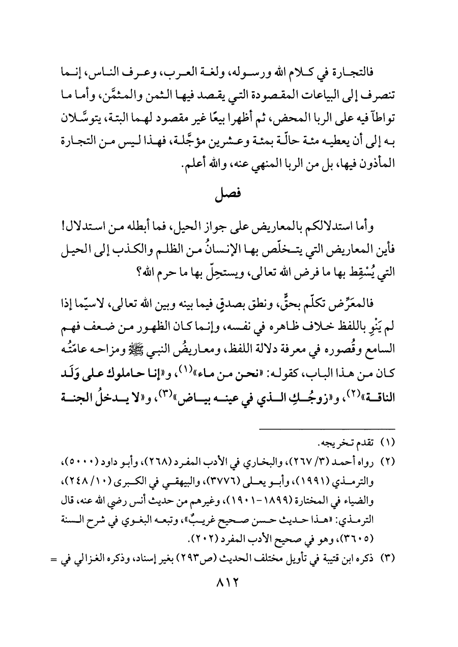 وأما استدلالكم بالمعاريض على جواز الحيل، فما أبطله من استدلال! فأين المعاريض التي يتخلّص بها الإنسانُ من الظلم والكذب إلى الحيل التي يُسْقِط بها ما فرض الله تعالى، ويستحِلّ بها ما حرم الله؟