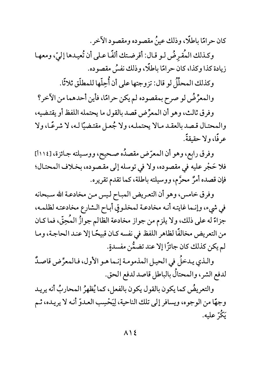 وفرق رابع، وهو أن المعرّض مقصدُه صحيح، ووسيلته جائزة، [١١٤ أ] فلا حَجْر عليه في مقصوده، ولا في توسله إلى مقصوده، بخلاف المحتال؛ فإن قصده أمرٌ محرَّم، ووسيلته باطلة، كما تقدم تقريره.