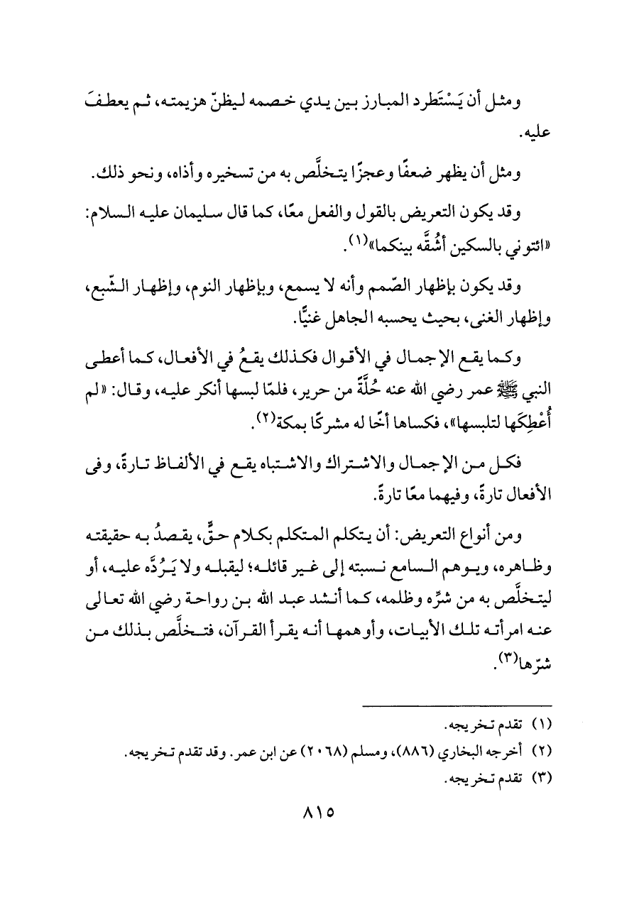 ومن أنواع التعريض: أن يتكلم المتكلم بكلام حقٍّ، يقصدُ به حقيقته وظاهره، ويوهم السامع نسبته إلى غير قائله؛ ليقبله ولا يَرُدَّه عليه، أو ليتخلَّص به من شرِّه وظلمه، كما أنشد عبد الله بن رواحة رضي الله تعالى عنه امرأته تلك الأبيات، وأوهمها أنه يقرأ القرآن، فتخلَّص بذلك من شرّها (¬٣).