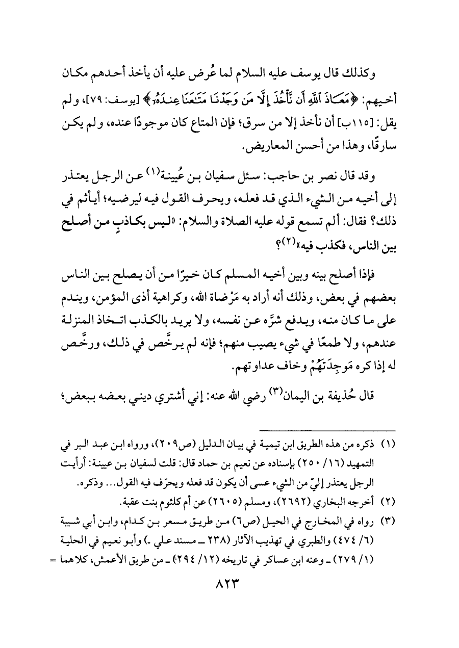 وقد قال نصر بن حاجب: سئل سفيان بن عُيينة (¬١) عن الرجل يعتذر إلى أخيه من الشيء الذي قد فعله، ويحرف القول فيه ليرضيه؛ أيأثم في ذلك؟ فقال: ألم تسمع قوله عليه الصلاة والسلام: «ليس بكاذبٍ من أصلح بين الناس، فكذب فيه» (¬٢)؟