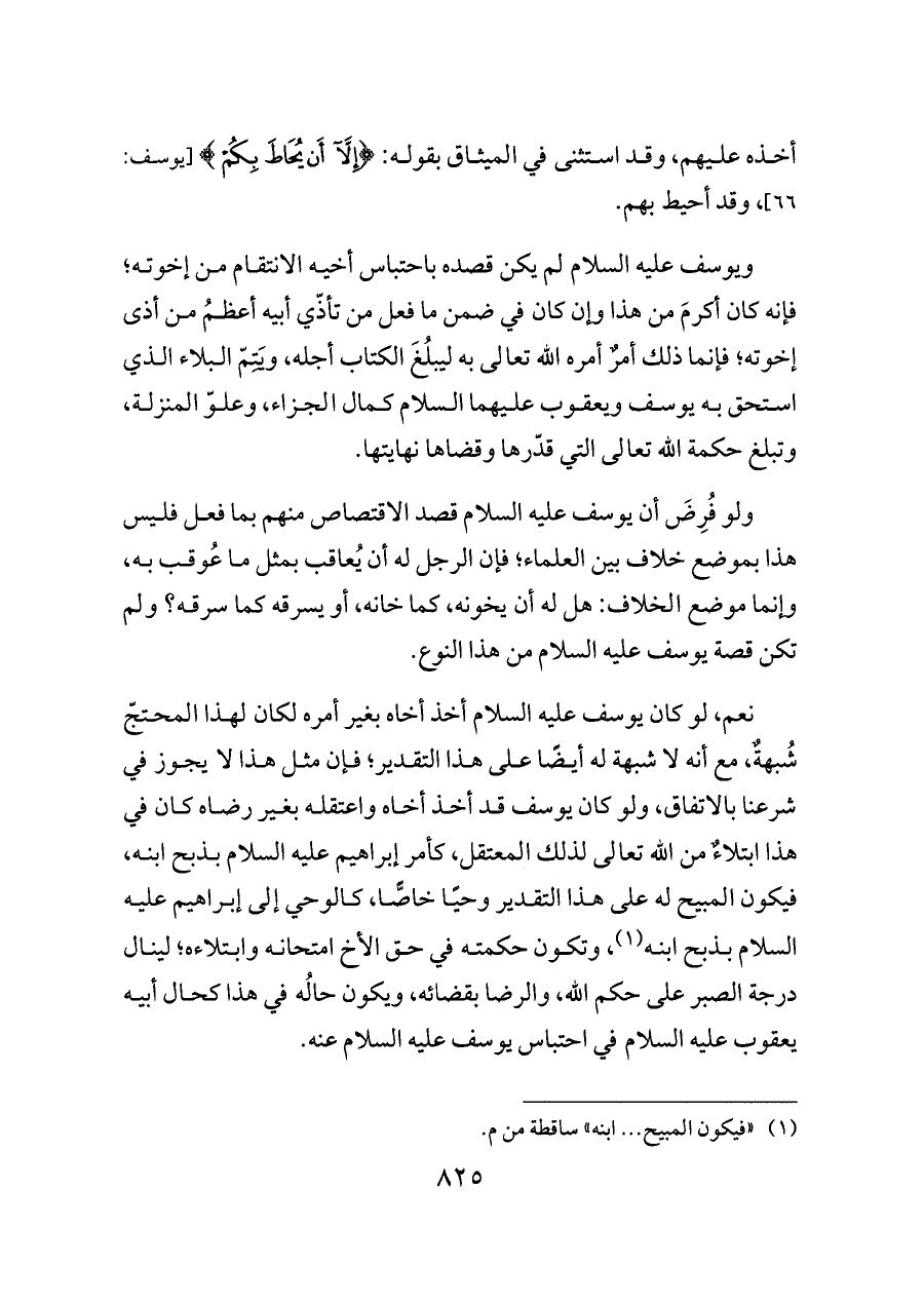 نعم، لو كان يوسف عليه السلام أخذ أخاه بغير أمره لكان لهذا المحتجّ شُبهةٌ، مع أنه لا شبهة له أيضًا على هذا التقدير؛ فإن مثل هذا لا يجوز في شرعنا بالاتفاق، ولو كان يوسف قد أخذ أخاه واعتقله بغير رضاه كان في هذا ابتلاءٌ من الله تعالى لذلك المعتقل، كأمر إبراهيم عليه السلام بذبح ابنه، فيكون المبيح له على هذا التقدير وحيًا خاصًّا، كالوحي إلى إبراهيم عليه السلام بذبح ابنه (¬١)، وتكون حكمته في حق الأخ امتحانه وابتلاءه؛ لينال درجة الصبر على حكم الله، والرضا بقضائه، ويكون حالُه في هذا كحال أبيه يعقوب عليه السلام في احتباس يوسف عليه السلام عنه.