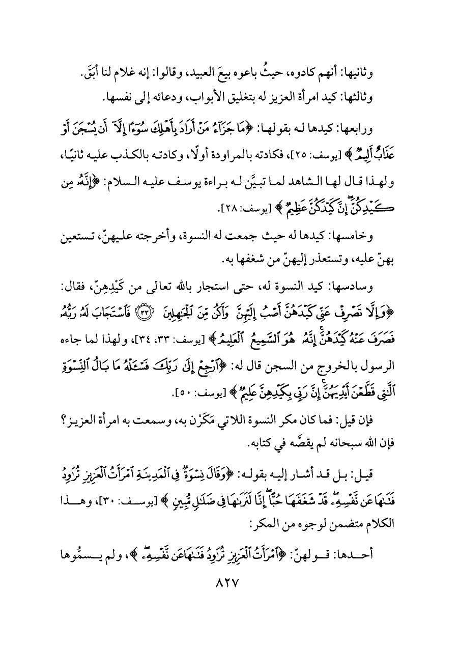 ورابعها: كيدها له بقولها: {مَا جَزَاءُ مَنْ أَرَادَ بِأَهْلِكَ سُوءًا إِلَّا أَنْ يُسْجَنَ أَوْ عَذَابٌ أَلِيمٌ} [يوسف: ٢٥]، فكادته بالمراودة أولًا، وكادته بالكذب عليه ثانيًا، ولهذا قال لها الشاهد لما تبيَّن له براءة يوسف عليه السلام: {إِنَّهُ مِنْ كَيْدِكُنَّ إِنَّ كَيْدَكُنَّ عَظِيمٌ} [يوسف: ٢٨].