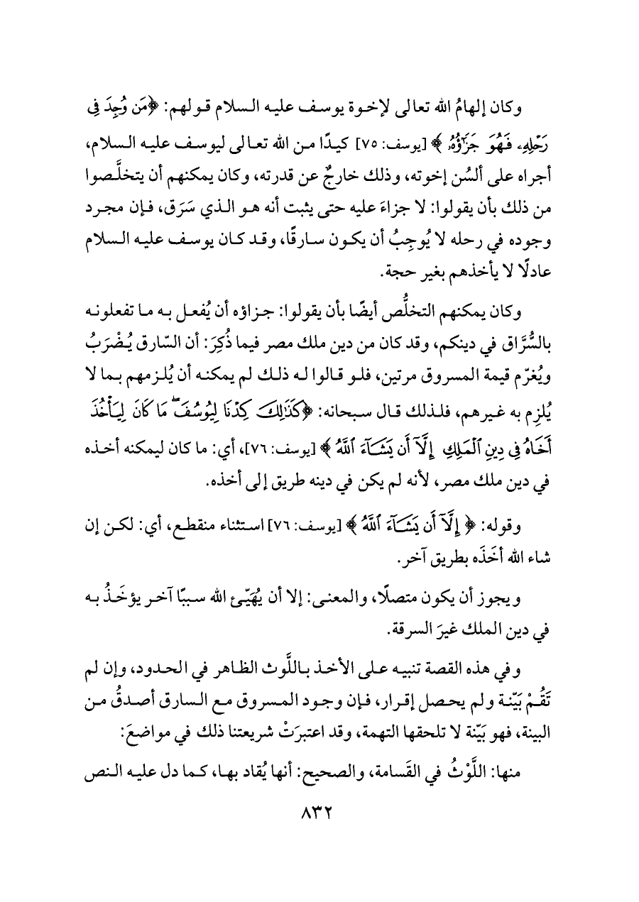 وكان يمكنهم التخلُّص أيضًا بأن يقولوا: جزاؤه أن يُفعل به ما تفعلونه بالسُّرَّاق في دينكم، وقد كان من دين ملك مصر فيما ذُكِرَ: أن السّارق يُضْرَبُ ويُغرّم قيمة المسروق مرتين، فلو قالوا له ذلك لم يمكنه أن يُلزمهم بما لا يُلزِم به غيرهم، فلذلك قال سبحانه: {كَذَلِكَ كِدْنَا لِيُوسُفَ مَا كَانَ لِيَأْخُذَ أَخَاهُ فِي دِينِ الْمَلِكِ إِلَّا أَنْ يَشَاءَ اللَّهُ} [يوسف: ٧٦]، أي: ما كان ليمكنه أخذه في دين ملك مصر، لأنه لم يكن في دينه طريق إلى أخذه.