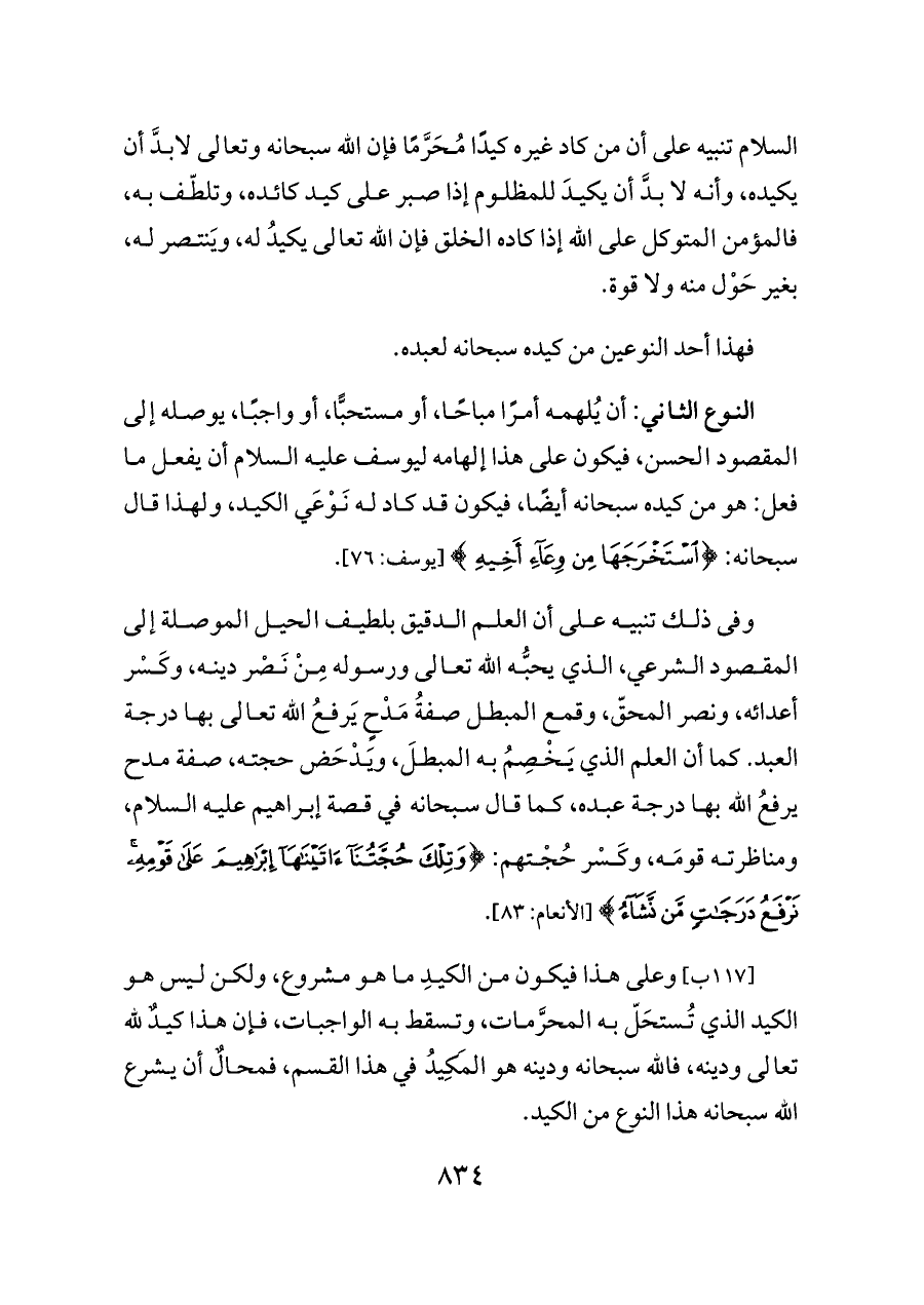 النوع الثاني: أن يُلهمه أمرًا مباحًا، أو مستحبًّا، أو واجبًا، يوصله إلى المقصود الحسن، فيكون على هذا إلهامه ليوسف عليه السلام أن يفعل ما فعل: هو من كيده سبحانه أيضًا، فيكون قد كاد له نَوْعَي الكيد، ولهذا قال سبحانه: {اسْتَخْرَجَهَا مِنْ وِعَاءِ أَخِيهِ} [يوسف: ٧٦].
