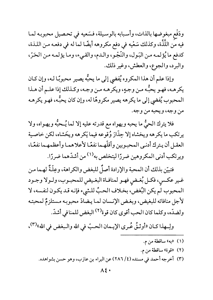 ودَفْعِ مبغوضها بالذات، وأسبابه بالوسيلة، فسَعيه في تحصيل محبوبه لما فيه من اللَّذَّة، وكذلك سَعْيه في دفع مكروهه أيضًا لما له في دفعه من اللذة، كدفع ما يُؤلمه من البَول، والنّجْو، والدم، والقيء، وما يؤلمه من الحَرّ، والبرد، والجوع، والعطش، وغير ذلك.