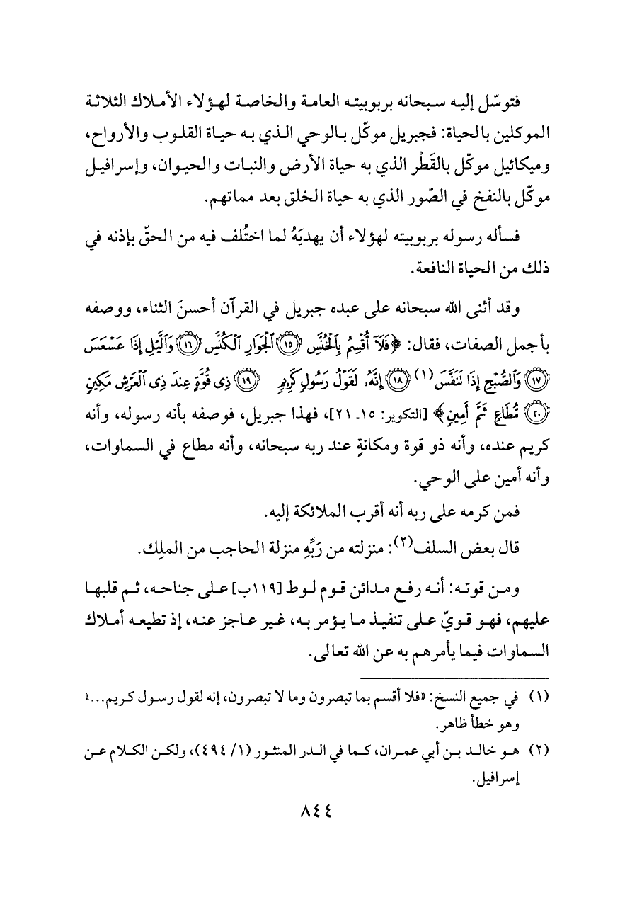 وقد أثنى الله سبحانه على عبده جبريل في القرآن أحسنَ الثناء، ووصفه بأجمل الصفات، فقال: {فَلَا أُقْسِمُ بِالْخُنَّسِ (١٥) الْجَوَارِ الْكُنَّسِ (١٦) وَاللَّيْلِ إِذَا عَسْعَسَ (١٧) وَالصُّبْحِ إِذَا تَنَفَّسَ (¬١) (١٨) إِنَّهُ لَقَوْلُ رَسُولٍ كَرِيمٍ (١٩) ذِي قُوَّةٍ عِنْدَ ذِي الْعَرْشِ مَكِينٍ (٢٠) مُطَاعٍ ثَمَّ أَمِينٍ} [التكوير: ١٥ ـ ٢١]، فهذا جبريل، فوصفه بأنه رسوله، وأنه كريم عنده، وأنه ذو قوة ومكانةٍ عند ربه سبحانه، وأنه مطاع في السماوات، وأنه أمين على الوحي.