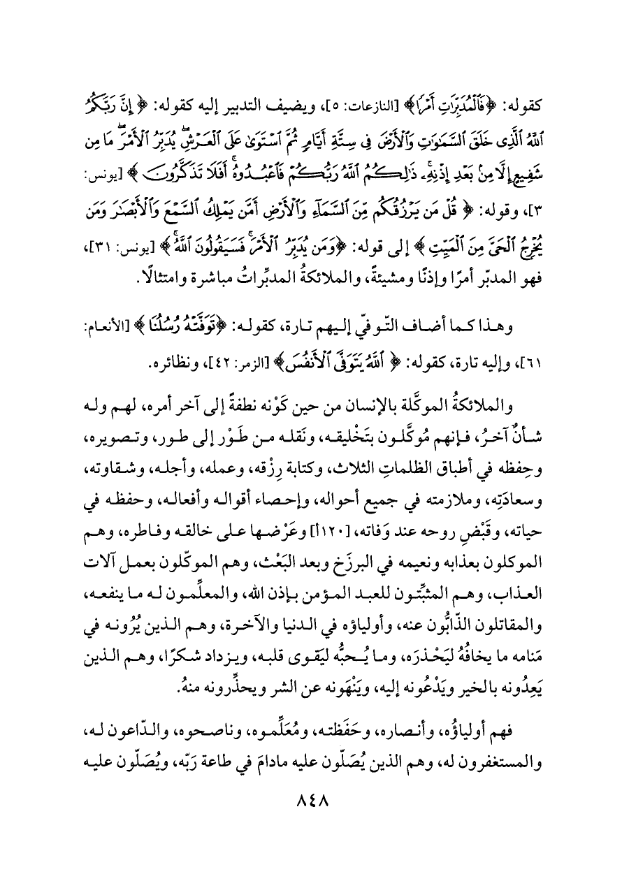 والملائكةُ الموكَّلة بالإنسان من حين كَوْنه نطفةً إلى آخر أمره، لهم وله شأنٌ آخرُ، فإنهم مُوكَّلون بتَخْليقه، ونَقله من طَوْر إلى طور، وتصويره، وحِفظه في أطباق الظلماتِ الثلاث، وكتابة رِزْقه، وعمله، وأجله، وشقاوته، وسعادَتِه، وملازمته في جميع أحواله، وإحصاء أقواله وأفعاله، وحفظه في حياته، وقَبْضِ روحه عند وَفاته، [١٢٠ أ] وعَرْضها على خالقه وفاطره، وهم الموكلون بعذابه ونعيمه في البرزَخ وبعد البَعْث، وهم الموكّلون بعمل آلات العذاب، وهم المثبِّتون للعبد المؤمن بإذن الله، والمعلِّمون له ما ينفعه، والمقاتلون الذّابُّون عنه، وأولياؤه في الدنيا والآخرة، وهم الذين يُرُونه في مَنامه ما يخافُهُ ليَحْذرَه، وما يُحبُّه ليَقوى قلبه، ويزداد شكرًا، وهم الذين يَعِدُونه بالخير ويَدْعُونه إليه، ويَنْهَونه عن الشر ويحذِّرونه منهُ.