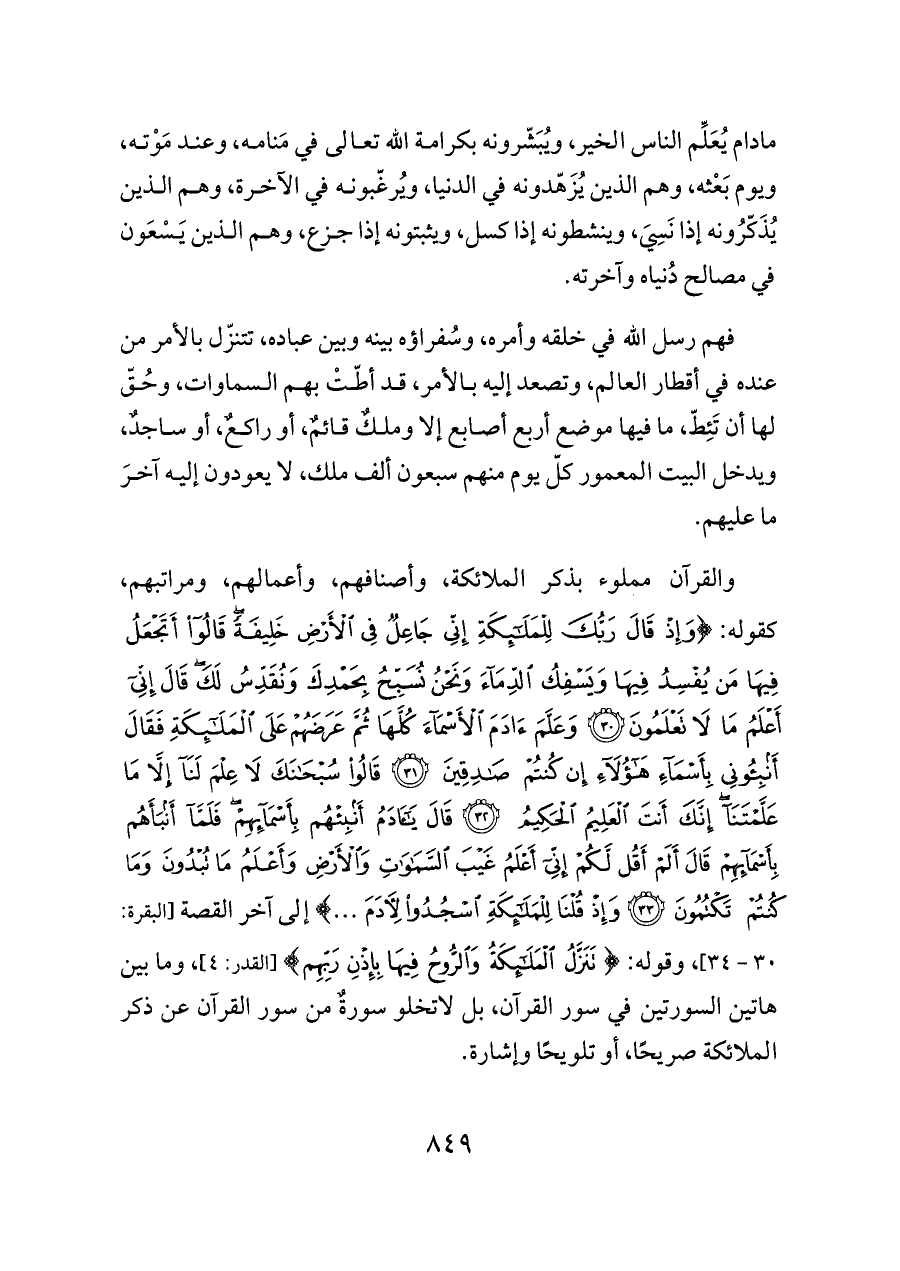 والقرآن مملوء بذكر الملائكة، وأصنافهم، وأعمالهم، ومراتبهم، كقوله: {وَإِذْ قَالَ رَبُّكَ لِلْمَلَائِكَةِ إِنِّي جَاعِلٌ فِي الْأَرْضِ خَلِيفَةً قَالُوا أَتَجْعَلُ فِيهَا مَنْ يُفْسِدُ فِيهَا وَيَسْفِكُ الدِّمَاءَ وَنَحْنُ نُسَبِّحُ بِحَمْدِكَ وَنُقَدِّسُ لَكَ قَالَ إِنِّي أَعْلَمُ مَا لَا تَعْلَمُونَ (٣٠) وَعَلَّمَ آدَمَ الْأَسْمَاءَ كُلَّهَا ثُمَّ عَرَضَهُمْ عَلَى الْمَلَائِكَةِ فَقَالَ أَنْبِئُونِي بِأَسْمَاءِ هَؤُلَاءِ إِنْ كُنْتُمْ صَادِقِينَ (٣١) قَالُوا سُبْحَانَكَ لَا عِلْمَ لَنَا إِلَّا مَا عَلَّمْتَنَا إِنَّكَ أَنْتَ الْعَلِيمُ الْحَكِيمُ (٣٢) قَالَ يَاآدَمُ أَنْبِئْهُمْ بِأَسْمَائِهِمْ فَلَمَّا أَنْبَأَهُمْ بِأَسْمَائِهِمْ قَالَ أَلَمْ أَقُلْ لَكُمْ إِنِّي أَعْلَمُ غَيْبَ السَّمَاوَاتِ وَالْأَرْضِ وَأَعْلَمُ مَا تُبْدُونَ وَمَا كُنْتُمْ تَكْتُمُونَ (٣٣) وَإِذْ قُلْنَا لِلْمَلَائِكَةِ اسْجُدُوا لِآدَمَ ... } إلى آخر القصة [البقرة: ٣٠ - ٣٤]، وقوله: {تَنَزَّلُ الْمَلَائِكَةُ وَالرُّوحُ فِيهَا بِإِذْنِ رَبِّهِمْ} [القدر: ٤]، وما بين هاتين السورتين في سور القرآن، بل لا تخلو سورةٌ من سور القرآن عن ذكر الملائكة صريحًا، أو تلويحًا وإشارة.