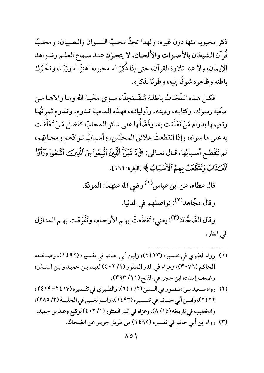 فكل هذه المَحَابِّ باطلة مُضْمَحِلّة، سوى مَحبة الله وما والاها من مَحبة رسوله، وكتابه، ودينه، وأوليائه، فهذه المحبة تدوم، وتدوم ثمرتُها ونعيمها بدوام مَنْ تَعَلّقت به، وفَضْلُها على سائر المحابّ كفضل مَنْ تَعَلّقت به على ما سواه، وإذا انقطعتْ علائق المحبِّين، وأسبابُ توادّهم ومحابّهم، لم تَنْقَطع أسبابُها، قال تعالى: {إِذْ تَبَرَّأَ الَّذِينَ اتُّبِعُوا مِنَ الَّذِينَ اتَّبَعُوا وَرَأَوُا الْعَذَابَ وَتَقَطَّعَتْ بِهِمُ الْأَسْبَابُ} [البقرة: ١٦٦].