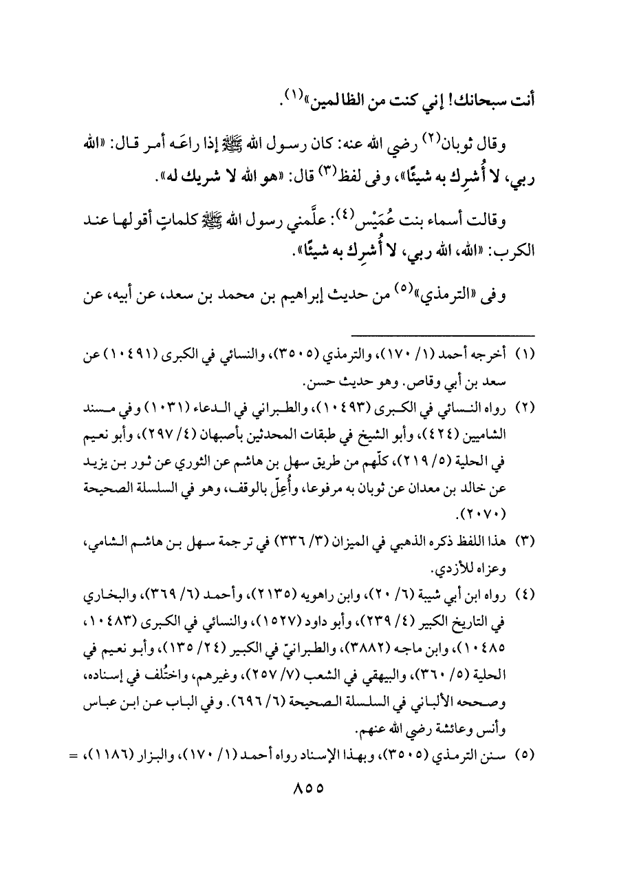 (¬٥) سنن الترمذي (٣٥٠٥)، وبهذا الإسناد رواه أحمد (١/ ١٧٠)، والبزار (١١٨٦)، والنسائي في الكبرى (١٠٤٩٢)، وأبو يعلى (٧٧٢)، والطبراني في الدعاء (١٢٤)، والبيهقي في الشعب (١/ ٤٣٢، ٧/ ٢٥٦)، والضياء في المختارة (١٠٤١، ١٠٤٢)، وفي إسناده بعض الاختلاف، وصحّحه الحاكم (١٨٦٢، ٣٤٤٤، ٤١٢١)، وقال الهيثمي في المجمع (٧/ ١٦٧، ١٠/ ٢٤٤): «رجاله رجال الصحيح، غير إبراهيم بن محمد بن سعد وهو ثقة»، وحسنه ابن حجر كما في الفتوحات الربانية (٤/ ١١)، وهو في السلسلة الصحيحة (١٧٤٤). وقد جاء أيضًا من طريق مصعب بن سعد، ومن طريق سعيد بن المسيب، ومن طريق أبي أمامة بن سهل، ثلاثتهم عن سعد بنحوه.
