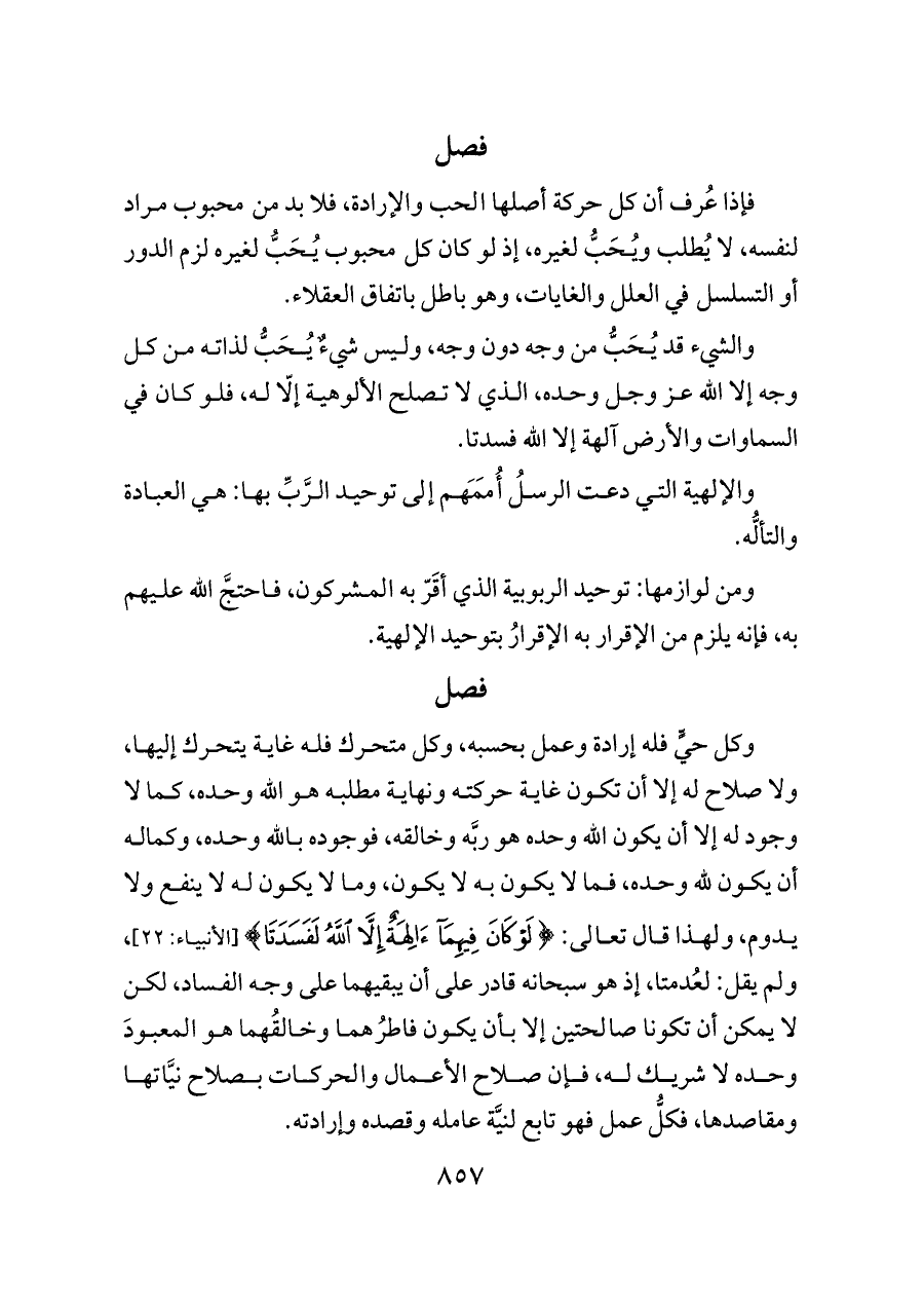 وكل حيٍّ فله إرادة وعمل بحسبه، وكل متحرك فله غاية يتحرك إليها، ولا صلاح له إلا أن تكون غاية حركته ونهاية مطلبه هو الله وحده، كما لا وجود له إلا أن يكون الله وحده هو ربَّه وخالقه، فوجوده بالله وحده، وكماله أن يكون لله وحده، فما لا يكون به لا يكون، وما لا يكون له لا ينفع ولا يدوم، ولهذا قال تعالى: {لَوْ كَانَ فِيهِمَا آلِهَةٌ إِلَّا اللَّهُ لَفَسَدَتَا} [الأنبياء: ٢٢]، ولم يقل: لعُدمتا، إذ هو سبحانه قادر على أن يبقيهما على وجه الفساد، لكن لا يمكن أن تكونا صالحتين إلا بأن يكون فاطرُهما وخالقُهما هو المعبودَ وحده لا شريك له، فإن صلاح الأعمال والحركات بصلاح نيَّاتها ومقاصدها، فكلُّ عمل فهو تابع لنيَّة عامله وقصده وإرادته.