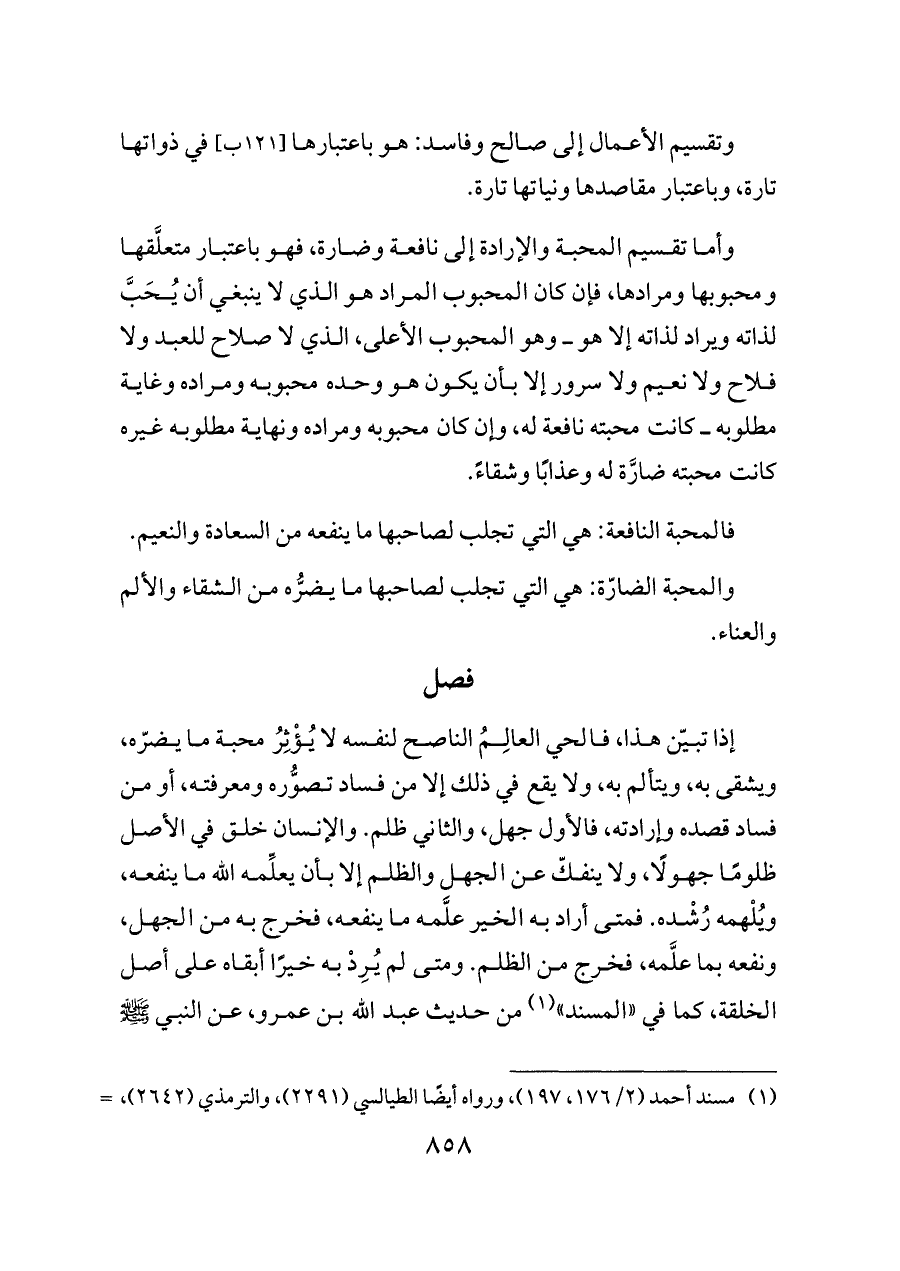 إذا تبيّن هذا، فالحي العالِمُ الناصح لنفسه لا يُؤْثِرُ محبة ما يضرّه، ويشقى به، ويتألم به، ولا يقع في ذلك إلا من فساد تصوُّره ومعرفته، أو من فساد قصده وإرادته، فالأول جهل، والثاني ظلم. والإنسان خلق في الأصل ظلومًا جهولًا، ولا ينفكّ عن الجهل والظلم إلا بأن يعلِّمه الله ما ينفعه، ويُلْهمه رُشْده. فمتى أراد به الخير علَّمه ما ينفعه، فخرج به من الجهل، ونفعه بما علَّمه، فخرج من الظلم. ومتى لم يُرِدْ به خيرًا أبقاه على أصل الخلقة، كما في «المسند» (¬١) من حديث عبد الله بن عمرو، عن النبي - صلى الله عليه وسلم -