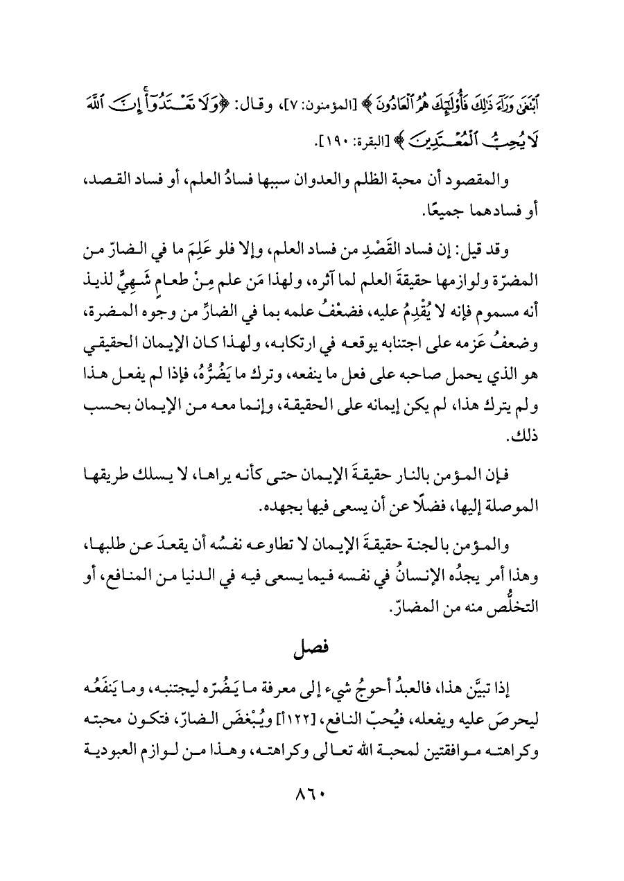 إذا تبيَّن هذا، فالعبدُ أحوجُ شيء إلى معرفة ما يَضُرّه ليجتنبه، وما يَنفَعُه ليحرصَ عليه ويفعله، فيُحبّ النافع، [١٢٢ أ] ويُبْغضَ الضارّ، فتكون محبته وكراهته موافقتين لمحبة الله تعالى وكراهته، وهذا من لوازم العبودية