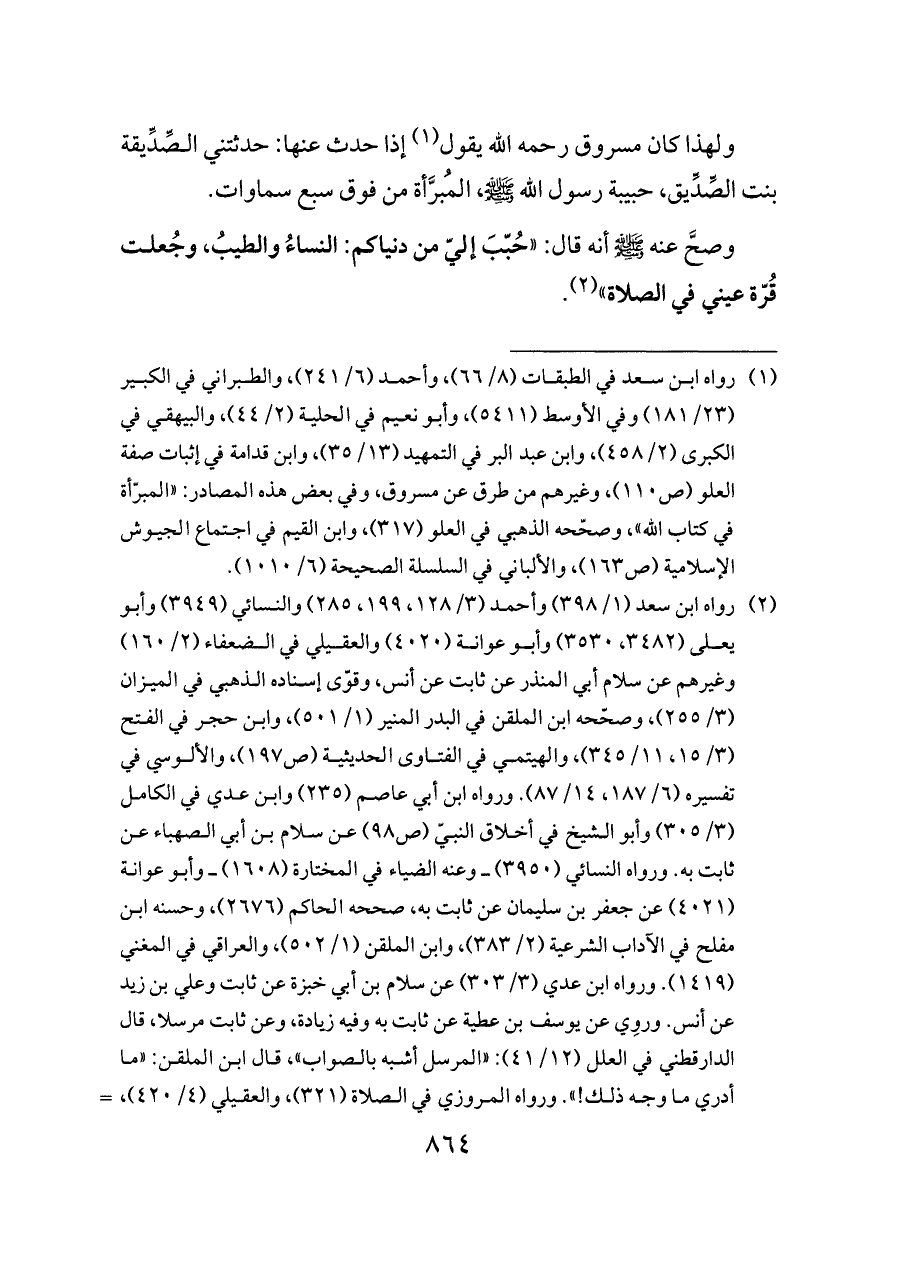 (¬١) رواه ابن سعد في الطبقات (٨/ ٦٦)، وأحمد (٦/ ٢٤١)، والطبراني في الكبير (٢٣/ ١٨١) وفي الأوسط (٥٤١١)، وأبو نعيم في الحلية (٢/ ٤٤)، والبيهقي في الكبرى (٢/ ٤٥٨)، وابن عبد البر في التمهيد (١٣/ ٣٥)، وابن قدامة في إثبات صفة العلو (ص ١١٠)، وغيرهم من طرق عن مسروق، وفي بعض هذه المصادر: «المبرّأة في كتاب الله»، وصحّحه الذهبي في العلو (٣١٧)، وابن القيم في اجتماع الجيوش الإسلامية (ص ١٦٣)، والألباني في السلسلة الصحيحة (٦/ ١٠١٠).