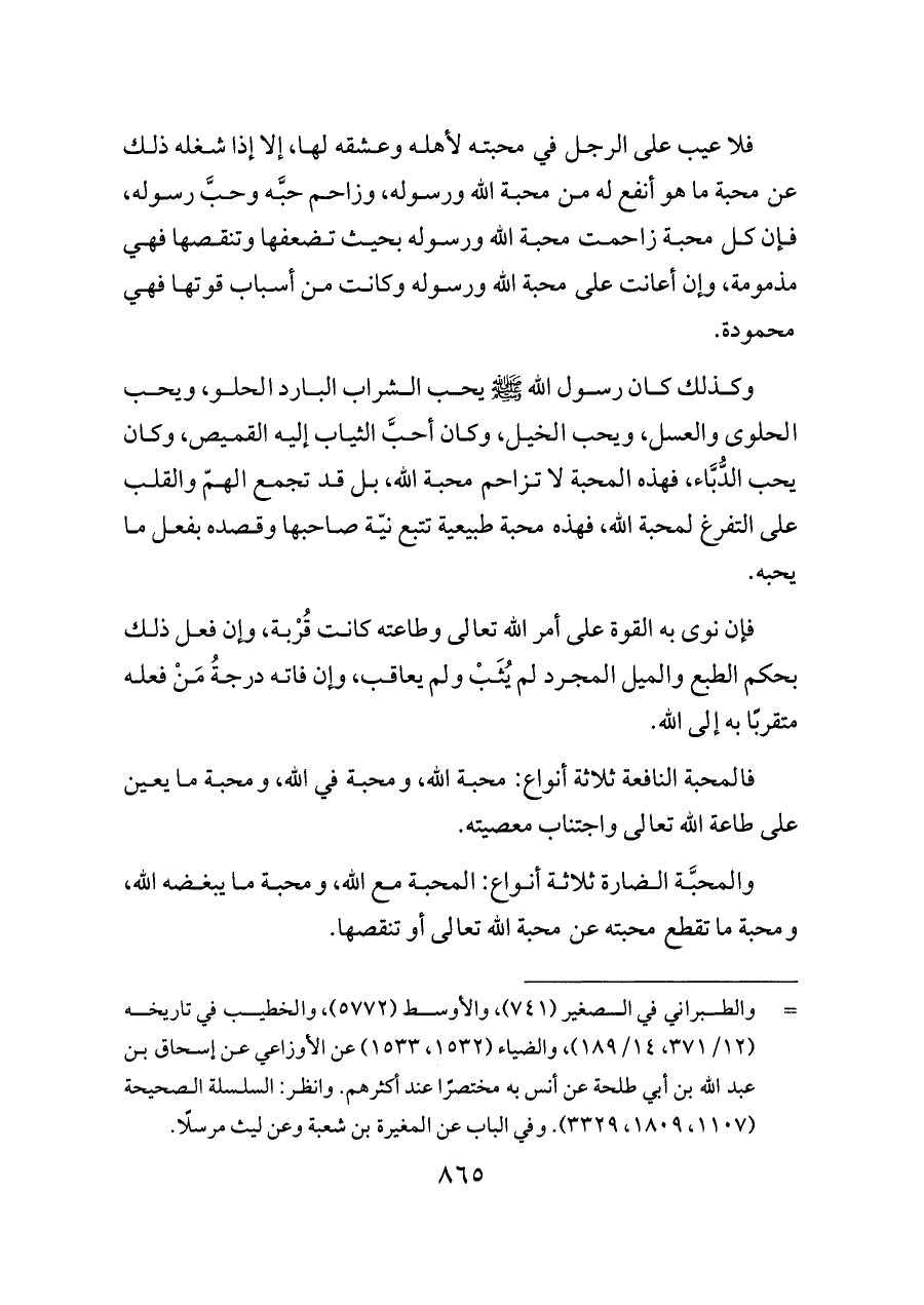 وكذلك كان رسول الله - صلى الله عليه وسلم - يحب الشراب البارد الحلو، ويحب الحلوى والعسل، ويحب الخيل، وكان أحبَّ الثياب إليه القميص، وكان يحب الدُّبَّاء، فهذه المحبة لا تزاحم محبة الله، بل قد تجمع الهمّ والقلب على التفرغ لمحبة الله، فهذه محبة طبيعية تتبع نيّة صاحبها وقصده بفعل ما يحبه.