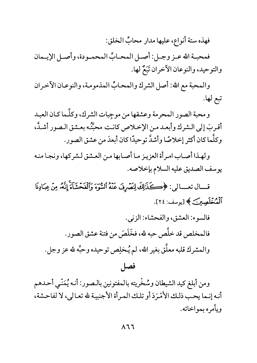 ومحبة الصور المحرمة وعشقها من موجِبات الشرك، وكلَّما كان العبد أقربَ إلى الشرك وأبعد من الإخلاص كانت محبَّتُه بعشق الصور أشدَّ، وكلَّما كان أكثر إخلاصًا وأشدَّ توحيدًا كان أبعدَ من عشق الصور.