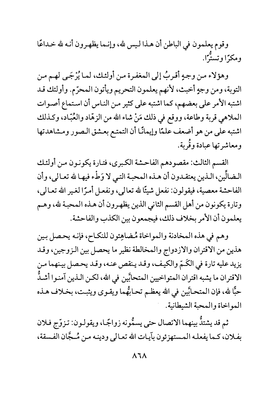 وهؤلاء من وجهٍ أقربُ إلى المغفرة من أولئك، لما يُرْجَى لهم من التوبة، ومن وجهٍ أخبث، لأنهم يعلمون التحريم ويأتون المحرّم. وأولئك قد اشتبه الأمر على بعضهم، كما اشتبه على كثير من الناس أن استماع أصوات الملاهي قربة وطاعة، ووقع في ذلك مَنْ شاء الله من الزهّاد والعُبّاد، وكذلك اشتبه على من هو أضعف علمًا وإيمانًا أن التمتع بعشق الصور ومشاهدتها ومعاشرتها عبادة وقُربة.