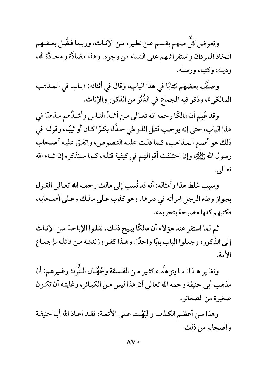 ثم لما استقر عند هؤلاء أن مالكًا يبيح ذلك، نقلوا الإباحة من الإناث إلى الذكور، وجعلوا الباب بابًا واحدًا. وهذا كفر وزندقة من قائله بإجماع الأمة.