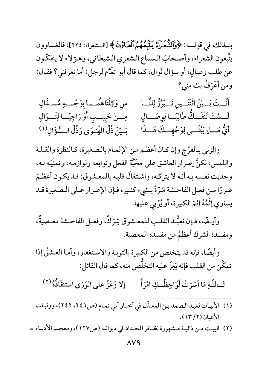 بذلك في قوله: {وَالشُّعَرَاءُ يَتَّبِعُهُمُ الْغَاوُونَ} [الشعراء: ٢٢٤]، فالغاوون يتَّبعون الشعراء، وأصحابَ السماع الشعري الشيطاني، وهؤلاء لا ينفكّون عن طلب وصالٍ، أو سؤال نَوال، كما قال أبو تَمَّام لرجل: أما تعرفني؟ فقال: ومن أعْرَفُ بك مني؟