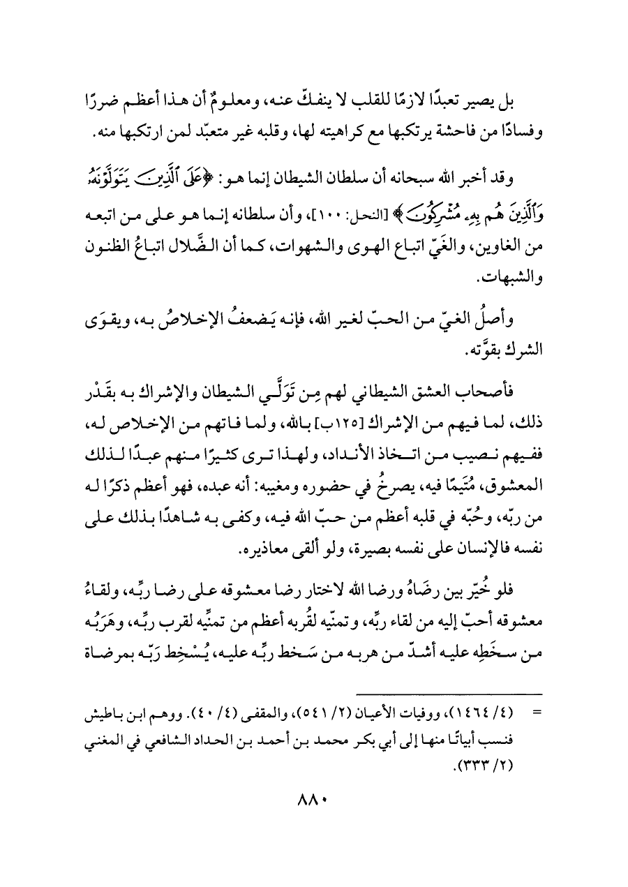 فأصحاب العشق الشيطاني لهم مِن تَوَلَّي الشيطان والإشراك به بقَدْر ذلك، لما فيهم من الإشراك [١٢٥ ب] بالله، ولما فاتهم من الإخلاص له، ففيهم نصيب من اتخاذ الأنداد، ولهذا ترى كثيرًا منهم عبدًا لذلك المعشوق، مُتَيمًا فيه، يصرخُ في حضوره ومغيبه: أنه عبده، فهو أعظم ذكرًا له من ربّه، وحُبّه في قلبه أعظم من حبّ الله فيه، وكفى به شاهدًا بذلك على نفسه فالإنسان على نفسه بصيرة، ولو ألقى معاذيره.