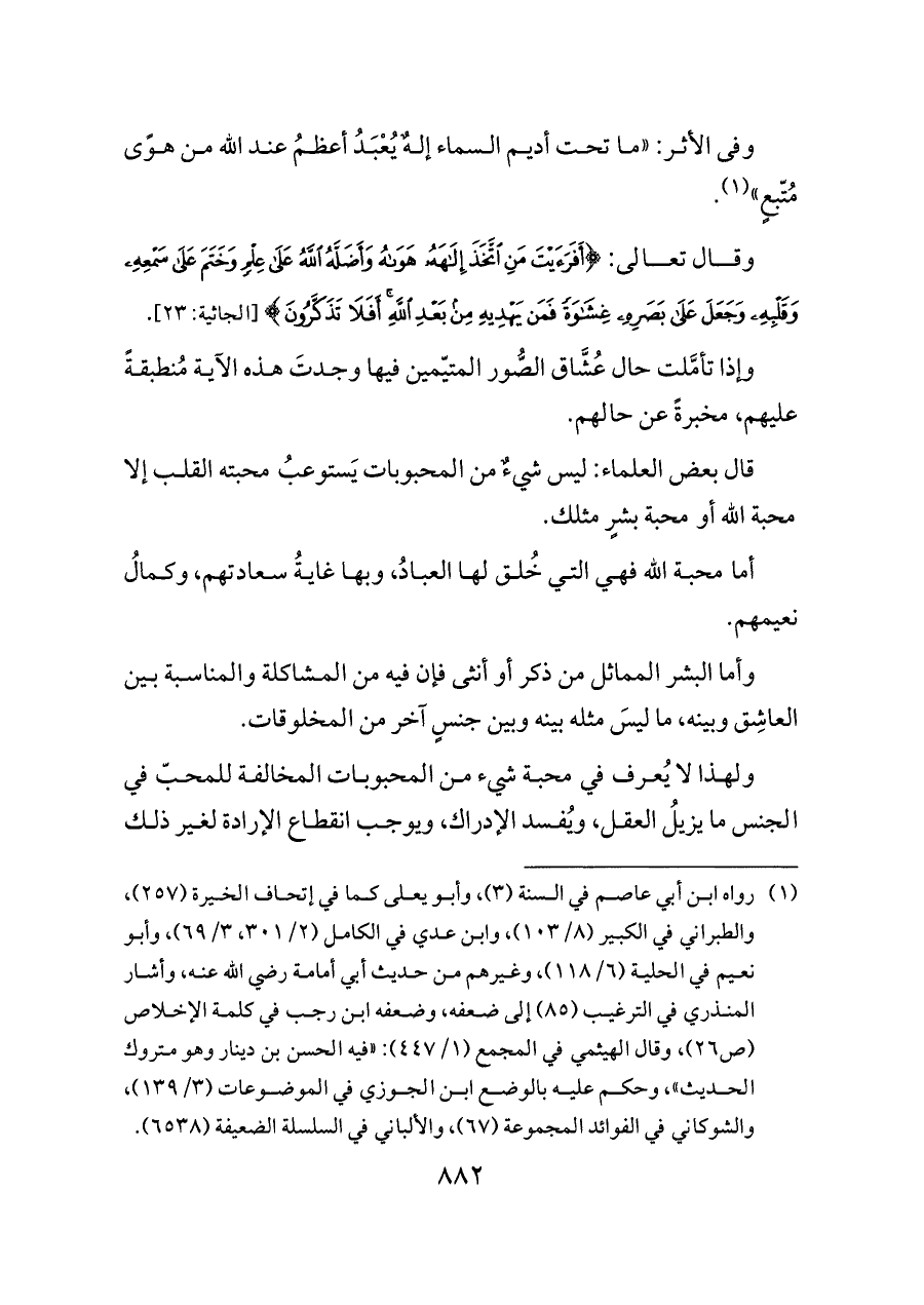 ولهذا لا يُعرف في محبة شيء من المحبوبات المخالفة للمحبّ في الجنس ما يزيلُ العقل، ويُفسد الإدراك، ويوجب انقطاع الإرادة لغير ذلك