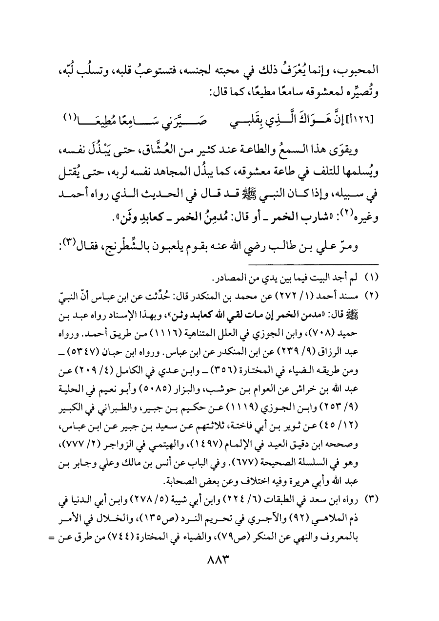 ويقوَى هذا السمعُ والطاعة عند كثير من العُشَّاق، حتى يَبْذُلَ نفسه، ويُسلمها للتلف في طاعة معشوقه، كما يبذُل المجاهد نفسه لربه، حتى يُقتل في سبيله، وإذا كان النبي - صلى الله عليه وسلم - قد قال في الحديث الذي رواه أحمد وغيره (¬٢): «شارب الخمر ــ أو قال: مُدمِنُ الخمر ــ كعابدِ وثَن».