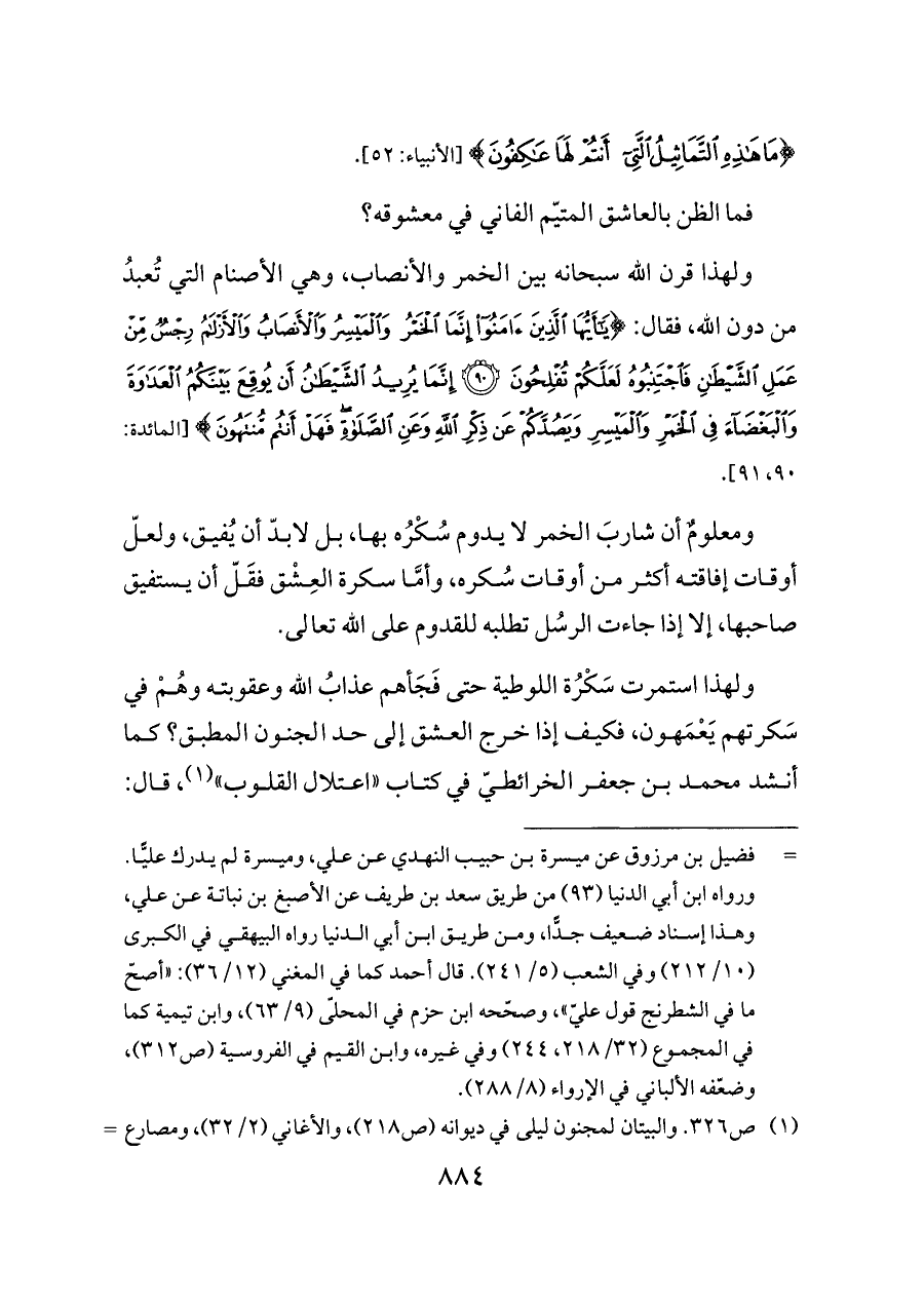 ولهذا استمرت سَكْرُة اللوطية حتى فَجَأهم عذابُ الله وعقوبته وهُمْ في سَكرتهم يَعْمَهون، فكيف إذا خرج العشق إلى حد الجنون المطبق؟ كما أنشد محمد بن جعفر الخرائطيّ في كتاب «اعتلال القلوب» (¬١)، قال: