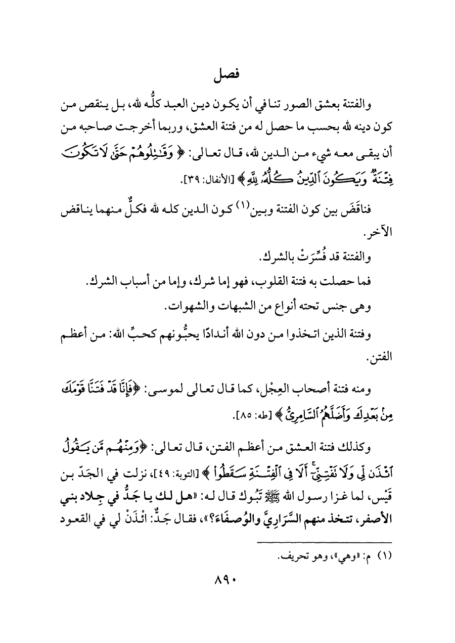 وكذلك فتنة العشق من أعظم الفتن، قال تعالى: {وَمِنْهُمْ مَنْ يَقُولُ ائْذَنْ لِي وَلَا تَفْتِنِّي أَلَا فِي الْفِتْنَةِ سَقَطُوا} [التوبة: ٤٩]، نزلت في الجَدّ بن قَيْس، لما غزا رسول الله - صلى الله عليه وسلم - تَبُوك قال له: «هل لك يا جَدُّ في جِلاد بني الأصفر، تتخذ منهم السَّرَارِيَّ والوُصفَاءَ؟»، فقال جَدٌّ: ائْذَنْ لي في القعود