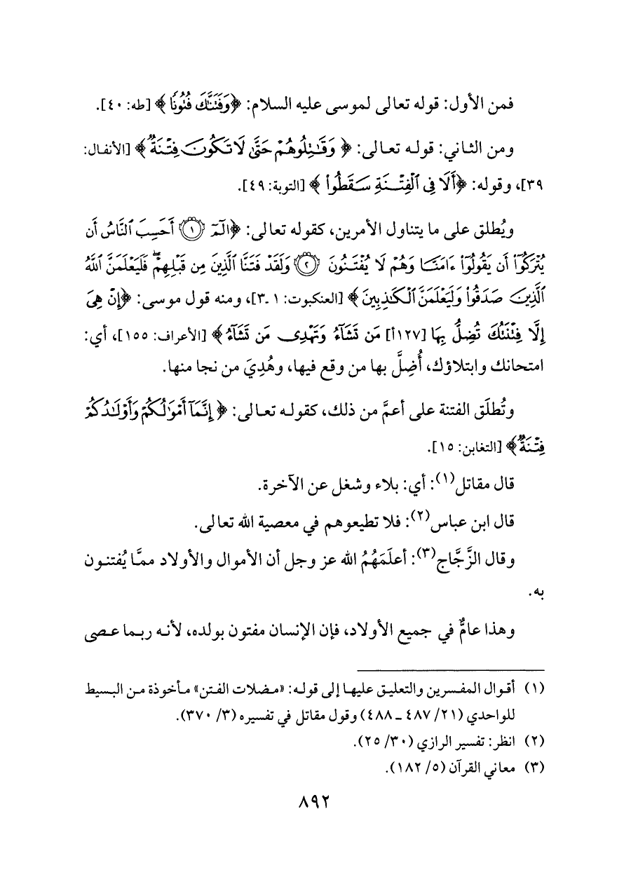 (¬١) أقوال المفسرين والتعليق عليها إلى قوله: «مضلات الفتن» مأخوذة من البسيط للواحدي (٢١/ ٤٨٧ ــ ٤٨٨) وقول مقاتل في تفسيره (٣/ ٣٧٠).