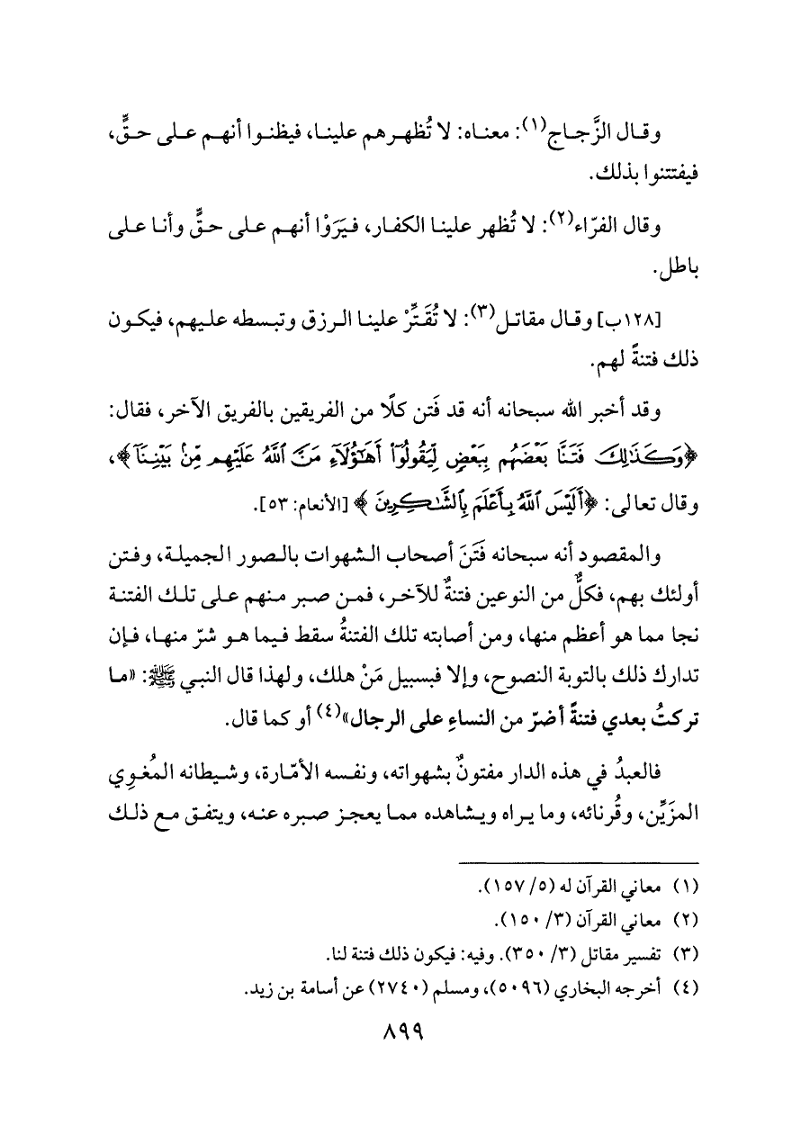 والمقصود أنه سبحانه فَتَنَ أصحاب الشهوات بالصور الجميلة، وفتن أولئك بهم، فكلٌّ من النوعين فتنةٌ للآخر، فمن صبر منهم على تلك الفتنة نجا مما هو أعظم منها، ومن أصابته تلك الفتنةُ سقط فيما هو شرّ منها، فإن تدارك ذلك بالتوبة النصوح، وإلا فبسبيل مَنْ هلك، ولهذا قال النبي - صلى الله عليه وسلم -: «ما تركتُ بعدي فتنةً أضرّ من النساءِ على الرجال» (¬٤) أو كما قال.