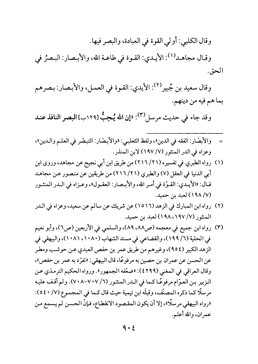 (¬١) رواه الطبري في تفسيره (٢١/ ٢١٦) من طريق ابن أبي نجيح عن مجاهد، وروى ابن أبي الدنيا في العقل (٧) والطبري (٢١/ ٢١٦) من طريقين عن منصور عن مجاهد قال: «الأيدي: القوّة في أمر الله، والأبصار: العقول»، وعزاه في الدر المنثور (٧/ ١٩٨) لعبد بن حميد.