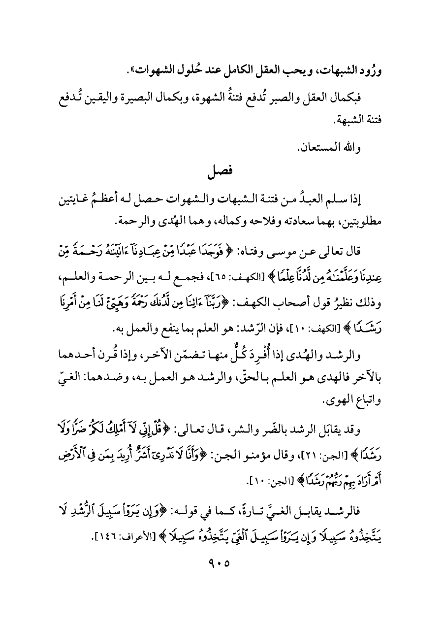 فبكمال العقل والصبر تُدفع فتنةُ الشهوة، وبكمال البصيرة واليقين تُدفع فتنة الشبهة.