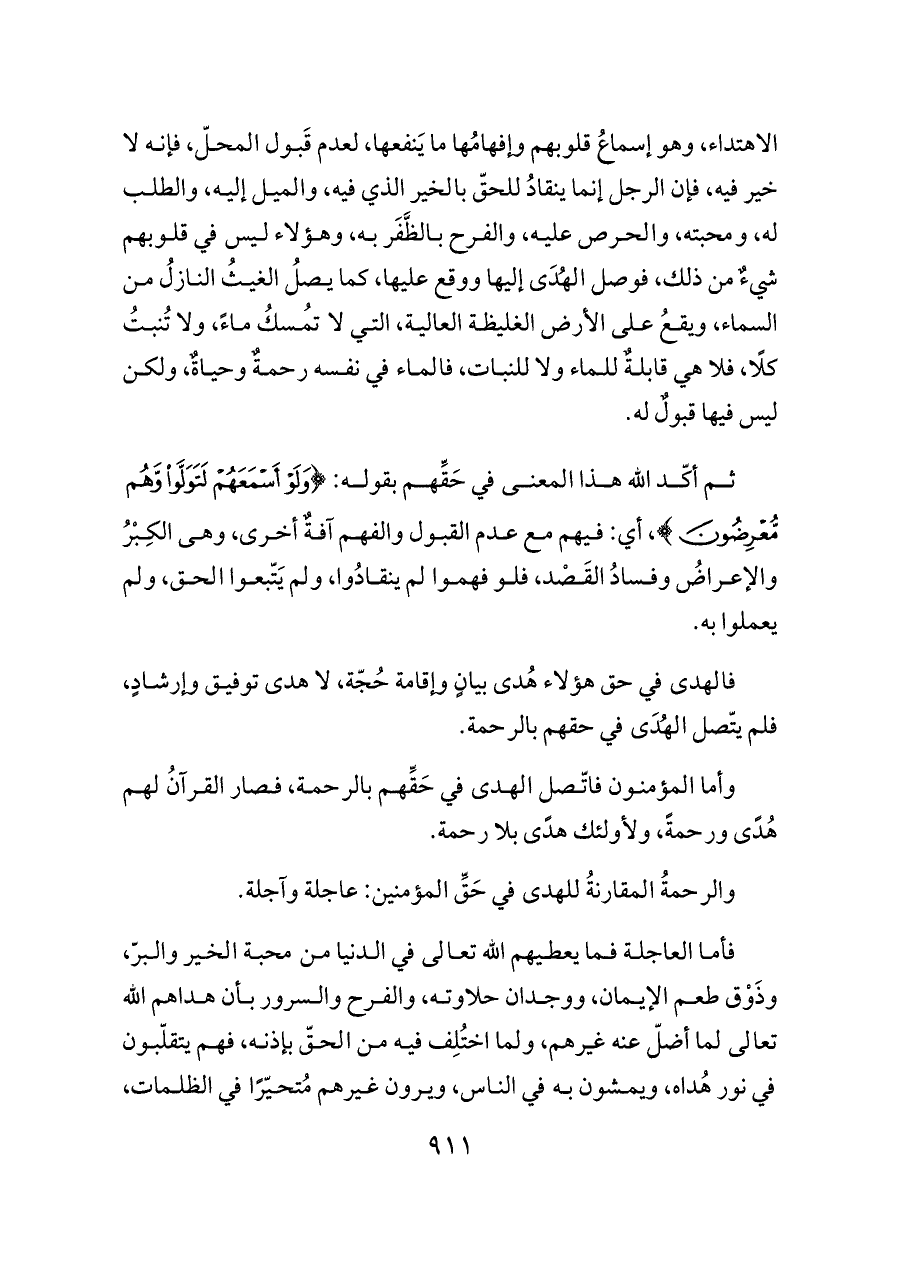 الاهتداء، وهو إسماعُ قلوبهم وإفهامُها ما يَنفعها، لعدم قَبول المحلّ، فإنه لا خير فيه، فإن الرجل إنما ينقادُ للحقّ بالخير الذي فيه، والميل إليه، والطلب له، ومحبته، والحرص عليه، والفرح بالظَّفَر به، وهؤلاء ليس في قلوبهم شيءٌ من ذلك، فوصل الهُدَى إليها ووقع عليها، كما يصلُ الغيثُ النازلُ من السماء، ويقعُ على الأرض الغليظة العالية، التي لا تُمسكُ ماءً، ولا تُنبتُ كلًا، فلا هي قابلةٌ للماء ولا للنبات، فالماء في نفسه رحمةٌ وحياةٌ، ولكن ليس فيها قبولٌ له.