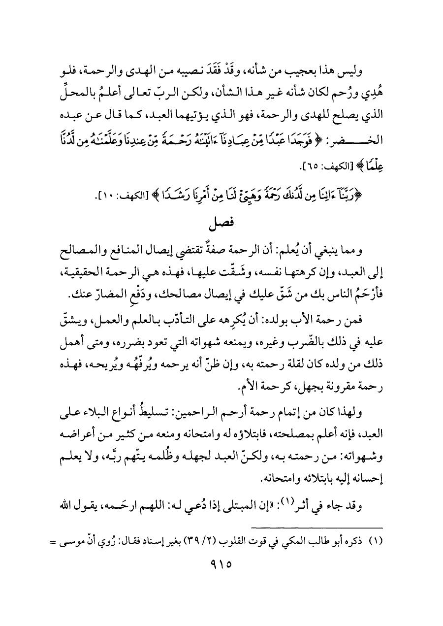 ومما ينبغي أن يُعلم: أن الرحمة صفةٌ تقتضي إيصال المنافع والمصالح إلى العبد، وإن كرهتها نفسه، وشَقّت عليها، فهذه هي الرحمة الحقيقية، فأرْحَمُ الناس بك من شَقّ عليك في إيصال مصالحك، ودَفْعِ المضارّ عنك.