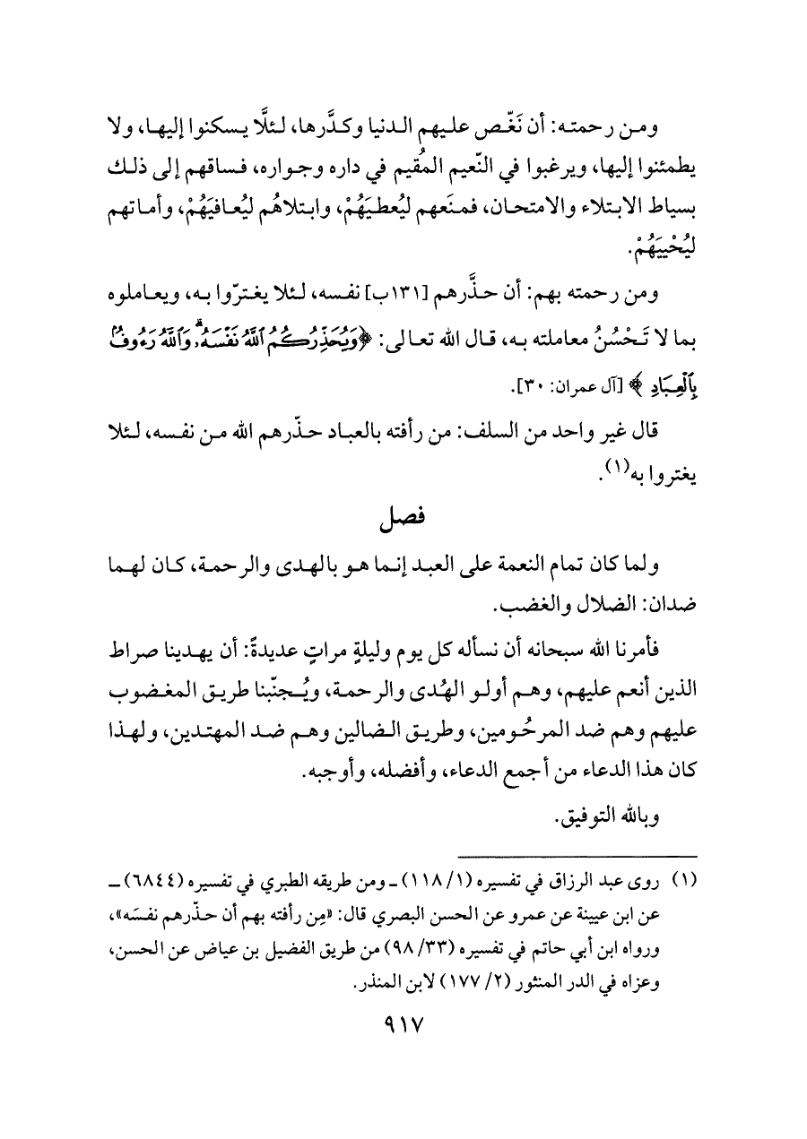 (¬١) روى عبد الرزاق في تفسيره (١/ ١١٨) ــ ومن طريقه الطبري في تفسيره (٦٨٤٤) ــ عن ابن عيينة عن عمرو عن الحسن البصري قال: «مِن رأفته بهم أن حذّرهم نفسَه»، ورواه ابن أبي حاتم في تفسيره (٣٣/ ٩٨) من طريق الفضيل بن عياض عن الحسن، وعزاه في الدر المنثور (٢/ ١٧٧) لابن المنذر.