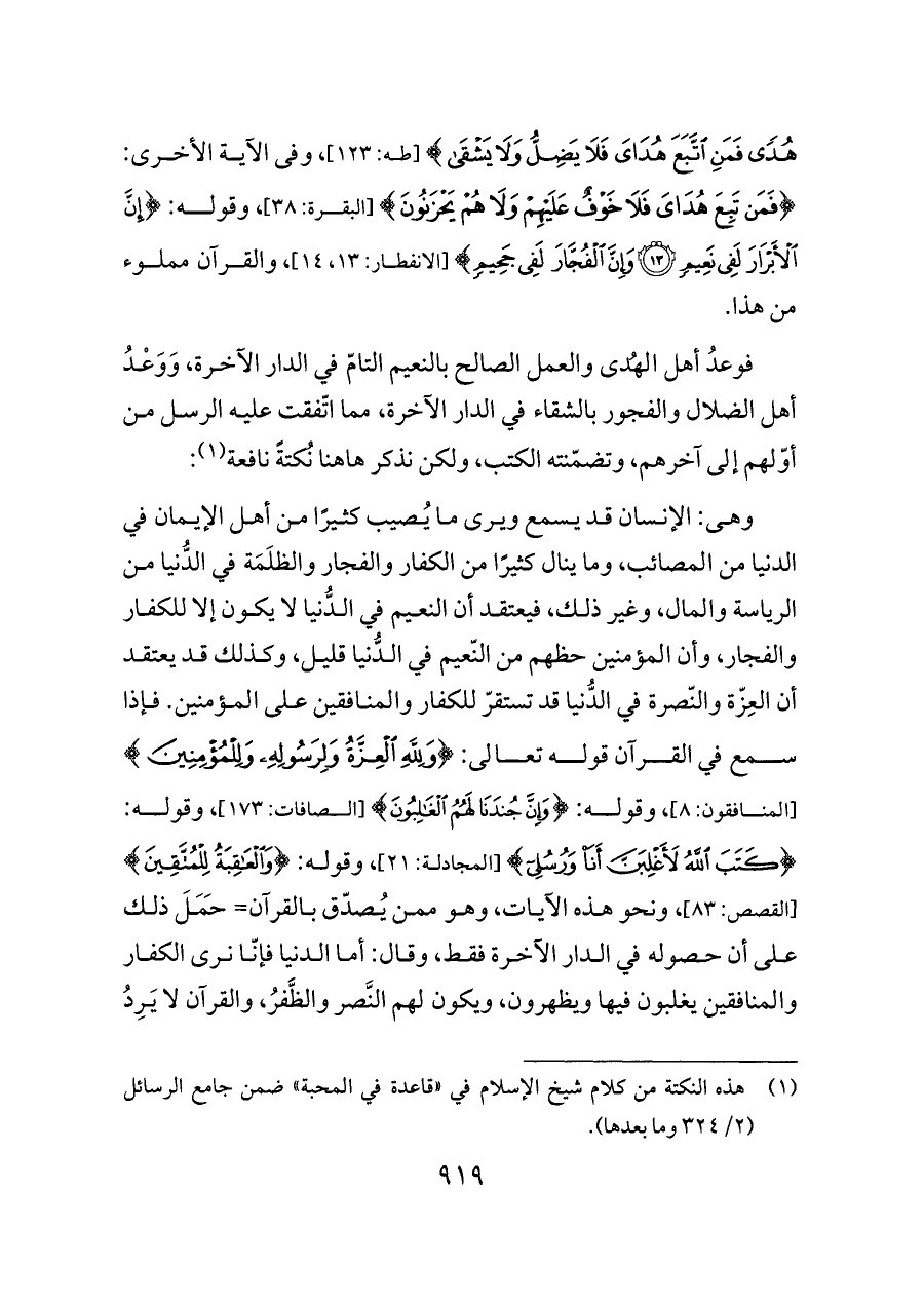 (¬١) هذه النكتة من كلام شيخ الإسلام في «قاعدة في المحبة» ضمن جامع الرسائل (٢/ ٣٢٤ وما بعدها).
