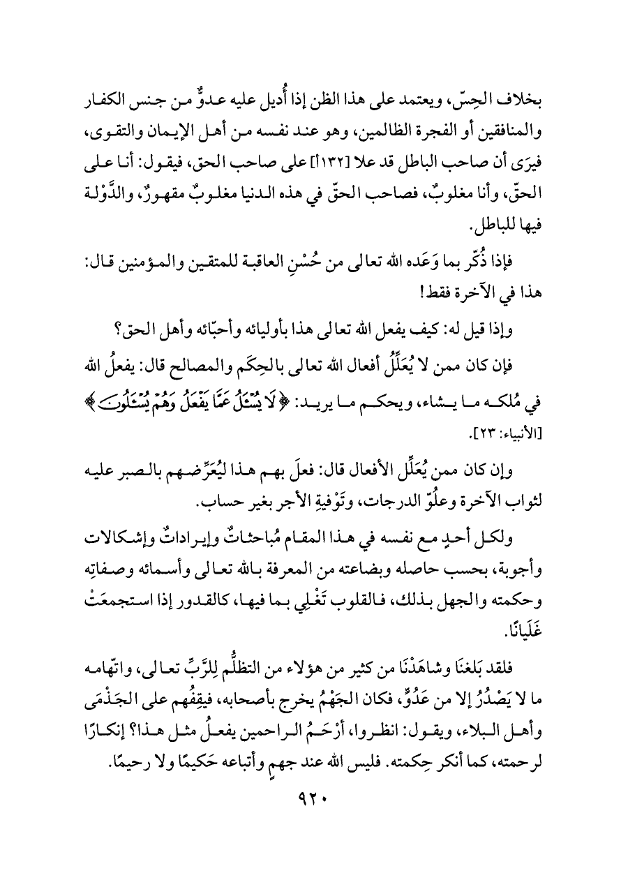 بخلاف الحِسّ، ويعتمد على هذا الظن إذا أُديل عليه عدوٌّ من جنس الكفار والمنافقين أو الفجرة الظالمين، وهو عند نفسه من أهل الإيمان والتقوى، فيرَى أن صاحب الباطل قد علا [١٣٢ أ] على صاحب الحق، فيقول: أنا على الحقّ، وأنا مغلوبٌ، فصاحب الحقّ في هذه الدنيا مغلوبٌ مقهورٌ، والدَّوْلة فيها للباطل.