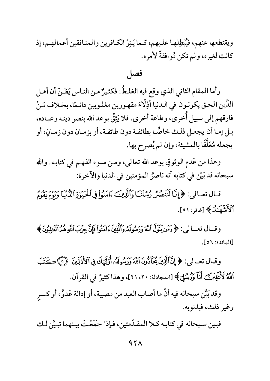 وأما المقام الثاني الذي وقع فيه الغلطُ: فكثيرٌ من الناس يَظنّ أن أهل الدِّين الحق يكونون في الدنيا أذِلّاءَ مقهورين مغلوبين دائمًا، بخلاف مَنْ فارقهم إلى سبيل أُخرى، وطاعة أخرى. فلا يَثِقُ بوعد الله بنصر دينه وعباده، بل إما أن يجعل ذلك خاصًّا بطائفة دون طائفة، أو بزمان دون زمانٍ، أو يجعله مُعَلَّقًا بالمشيئة، وإن لم يُصرح بها.