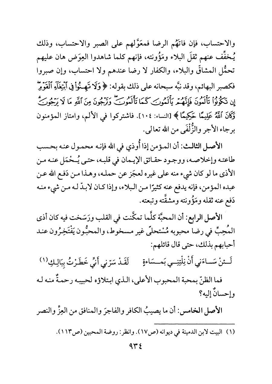 والاحتساب، فإن فاتَهُم الرضا فمعَوَّلهم على الصبر والاحتساب، وذلك يُخفِّف عنهم ثقلَ البلاء ومَؤُونته، فإنهم كلما شاهدوا العِوَض هان عليهم تحمُّل المشاقّ والبلاء، والكفار لا رضا عندهم ولا احتساب، وإن صبروا فكصبر البهائم، وقد نبَّه سبحانه على ذلك بقوله: {وَلَا تَهِنُوا فِي ابْتِغَاءِ الْقَوْمِ إِنْ تَكُونُوا تَأْلَمُونَ فَإِنَّهُمْ يَأْلَمُونَ كَمَا تَأْلَمُونَ وَتَرْجُونَ مِنَ اللَّهِ مَا لَا يَرْجُونَ وَكَانَ اللَّهُ عَلِيمًا حَكِيمًا} [النساء: ١٠٤]. فاشتركوا في الألم، وامتاز المؤمنون برجاء الأجر والزُّلْفَى من الله تعالى.