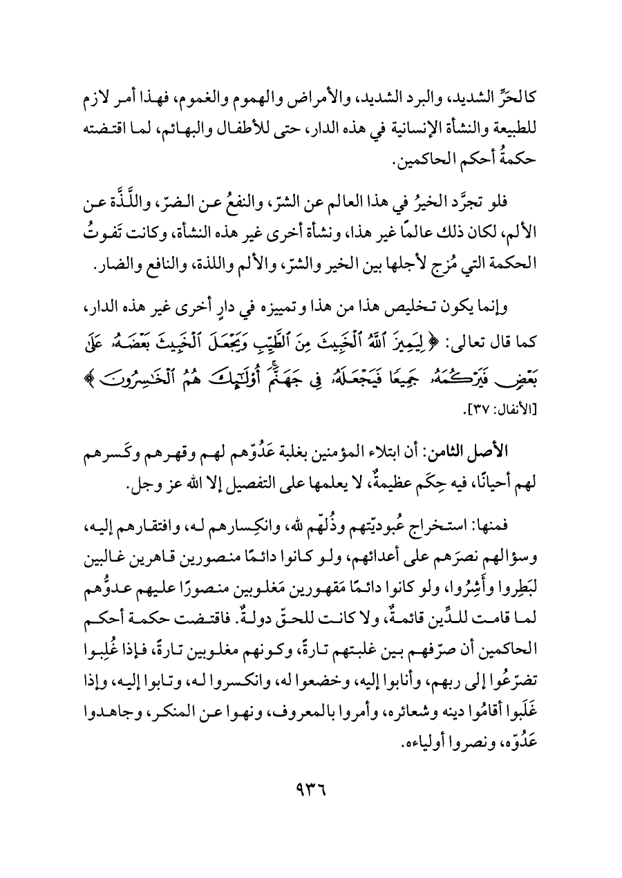 فلو تجرَّد الخيرُ في هذا العالم عن الشرّ، والنفعُ عن الضرّ، واللَّذَّة عن الألم، لكان ذلك عالمًا غير هذا، ونشأة أخرى غير هذه النشأة، وكانت تَفوتُ الحكمة التي مُزج لأجلها بين الخير والشرّ، والألم واللذة، والنافع والضار.