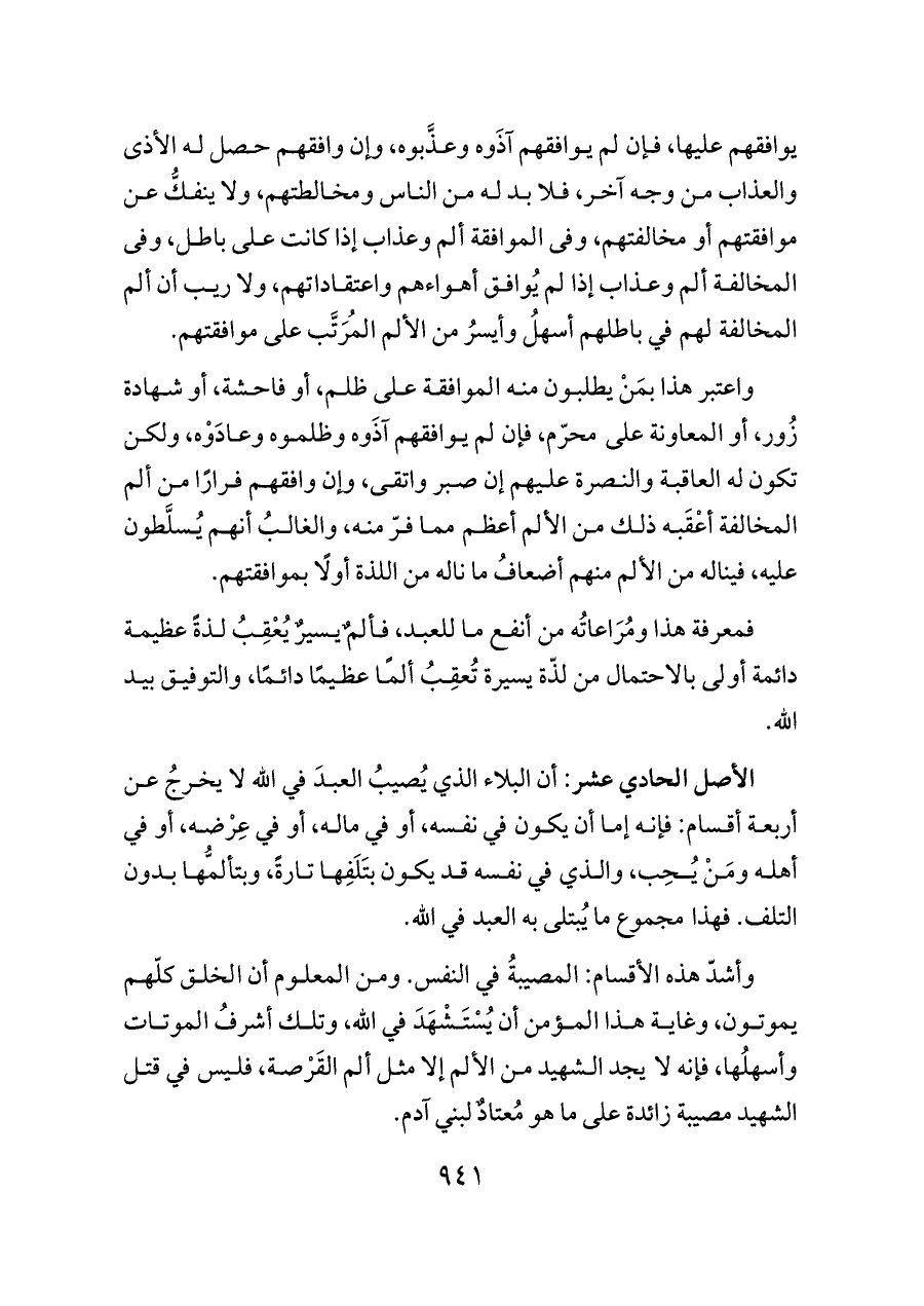 يوافقهم عليها، فإن لم يوافقهم آذَوه وعذَّبوه، وإن وافقهم حصل له الأذى والعذاب من وجه آخر، فلا بد له من الناس ومخالطتهم، ولا ينفكُّ عن موافقتهم أو مخالفتهم، وفى الموافقة ألم وعذاب إذا كانت على باطل، وفى المخالفة ألم وعذاب إذا لم يُوافق أهواءهم واعتقاداتهم، ولا ريب أن ألم المخالفة لهم في باطلهم أسهلُ وأيسرُ من الألم المُرَتَّب على موافقتهم.