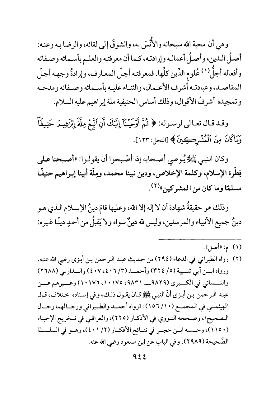 وكان النبي - صلى الله عليه وسلم - يُوصي أصحابه إذا أصْبحوا أن يقولوا: «أصبحنا على فِطْرة الإسلام، وكلمة الإخلاص، ودين نبينا محمد، ومِلّة أبينا إبراهيم حنيفًا مسلمًا وما كان من المشركين» (¬٢).