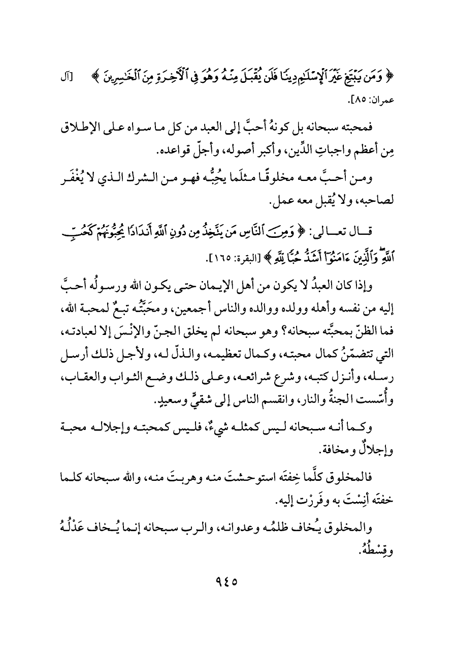 ومن أحبَّ معه مخلوقًا مثلَما يُحِبُّه فهو من الشرك الذي لا يُغْفَر لصاحبه، ولا يُقبل معه عمل.