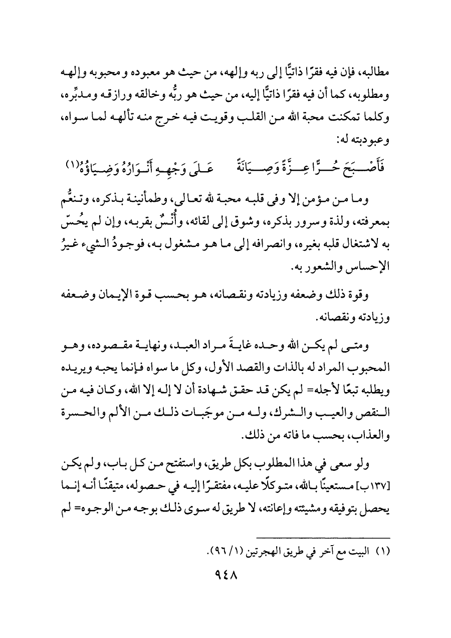 مطالبه، فإن فيه فقرًا ذاتيًّا إلى ربه وإلهه، من حيث هو معبوده ومحبوبه وإلهه ومطلوبه، كما أن فيه فقرًا ذاتيًّا إليه، من حيث هو ربُّه وخالقه ورازقه ومدبِّره، وكلما تمكنت محبة الله من القلب وقويت فيه خرج منه تألهه لما سواه، وعبودبته له: